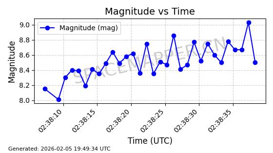 | ORBCOMM FM 38 | 33060 | 33060 | 2008-06-19 同日期轨道 2008-031A 同批次轨道 | 在轨 | 97分钟 | 48.4389 | 617.838 | 624.556 | 0.0004799 | 2026-02-05 02:34:21 | ||