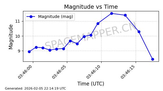| PELICAN 3001 | 58296 | 58296 | 2023-11-11 同日期轨道 2023-174AS 同批次轨道 | 在轨 | 92分钟 | 97.4032 | 389.656 | 401.628 | 0.0008837 | 2026-02-06 07:18:57 | ![]() | |