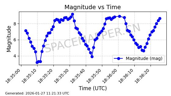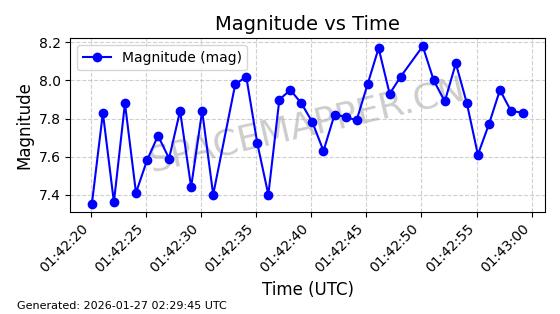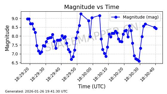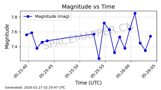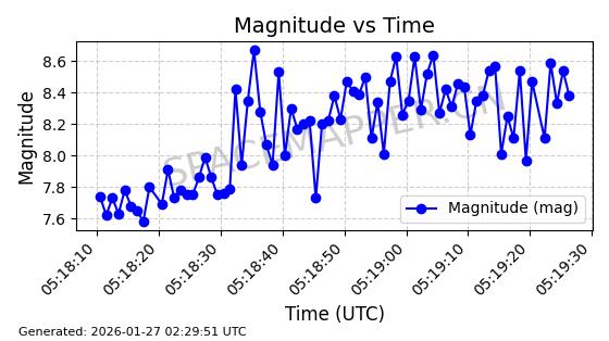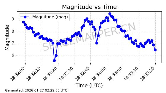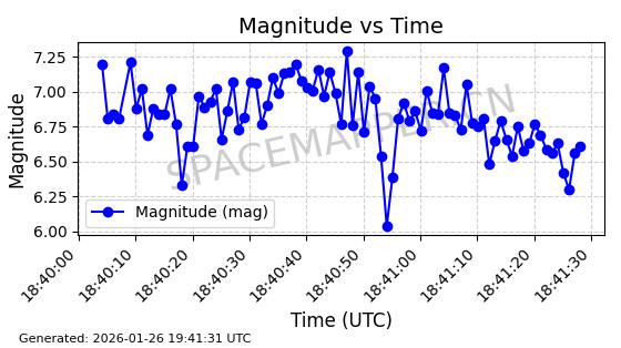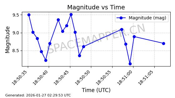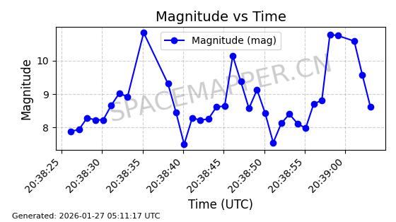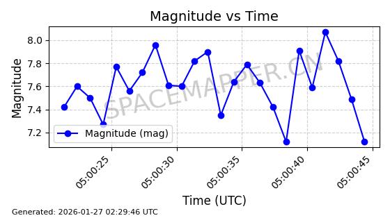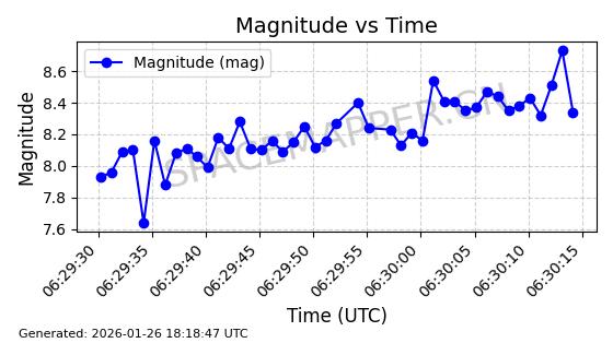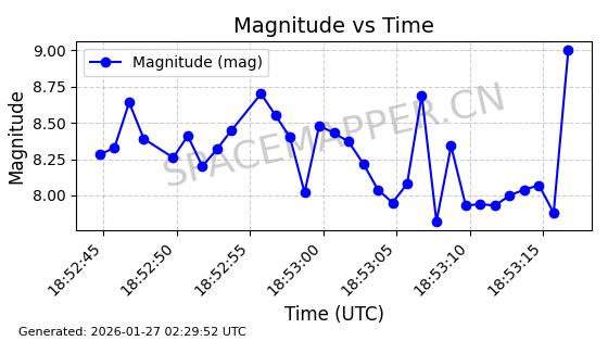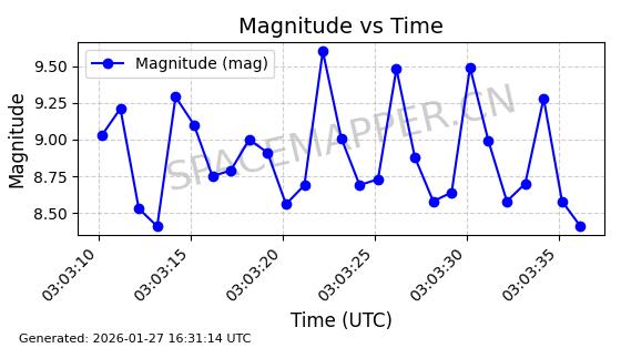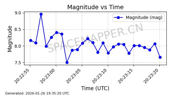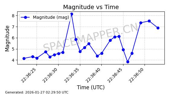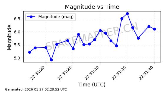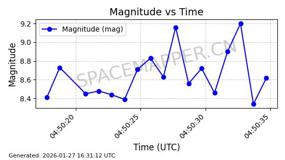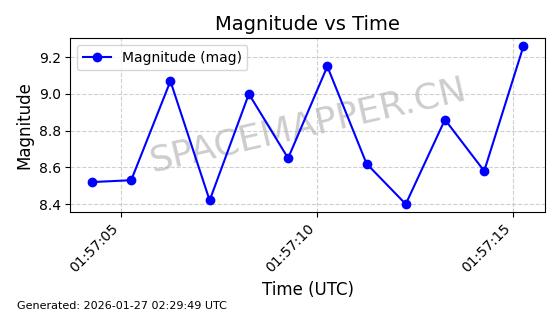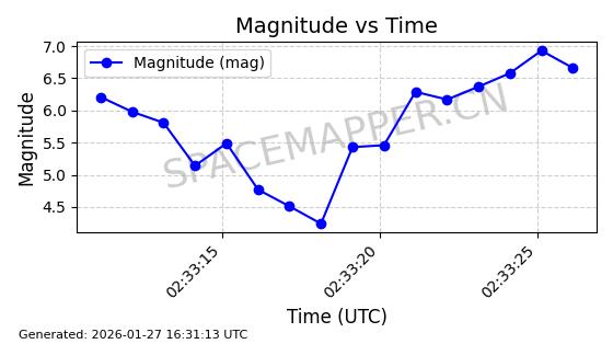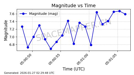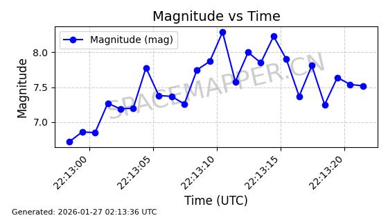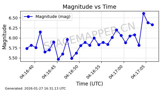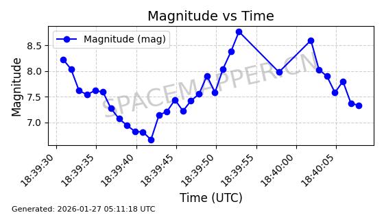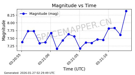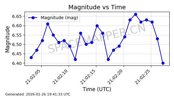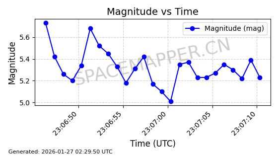 | QIANFAN-60 | 62790 | 62790 | 2025-01-23 同日期轨道 2025-016F 同批次轨道 | 在轨 | 107分钟 | 88.9732 | 1057.137 | 1080.117 | 0.0015429 | 2026-01-27 06:07:31 | ![]() | |