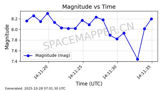 | STARLINK-11101 | 59715 | 59715 | 2024-05-10 同日期轨道 2024-088H 同批次轨道 | 在轨 | 92分钟 | 53.1571 | 359.012 | 360.476 | 0.0001085 | 2025-10-27 21:02:20 | ||