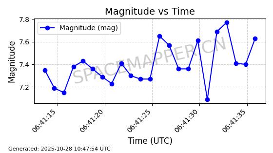 | STARLINK-11110 | 59762 | 59762 | 2024-05-14 同日期轨道 2024-091K 同批次轨道 | 在轨 | 92分钟 | 53.1585 | 359.145 | 360.339 | 0.0000886 | 2025-10-27 20:41:09 | ||