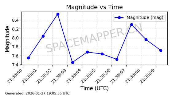 | STARLINK-11109 | 60306 | 60306 | 2024-07-28 同日期轨道 2024-133F 同批次轨道 | 在轨 | 92分钟 | 53.1567 | 359.003 | 360.325 | 0.0000980 | 2026-01-27 04:02:51 | ||