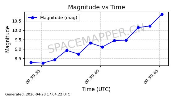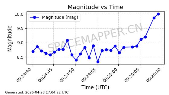 | STARLINK-11100 | 59713 | 59713 | 2024-05-10 同日期轨道 2024-088F 同批次轨道 | 在轨 | 92分钟 | 53.1577 | 359.012 | 360.482 | 0.0001090 | 2026-04-28 07:17:44 | ||