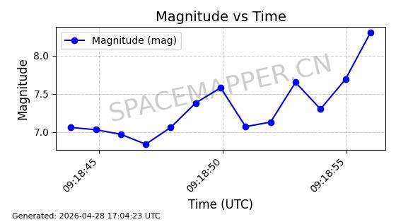| STARLINK-11083 | 59424 | 59424 | 2024-04-07 同日期轨道 2024-065D 同批次轨道 | 在轨 | 92分钟 | 53.1600 | 358.652 | 360.892 | 0.0001661 | 2026-04-28 05:38:08 | ||