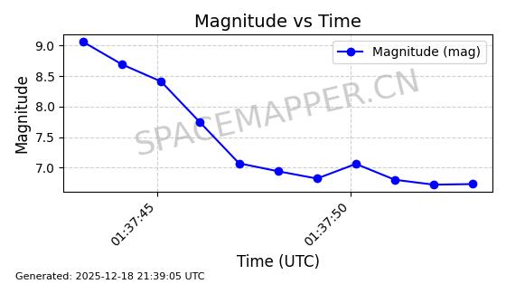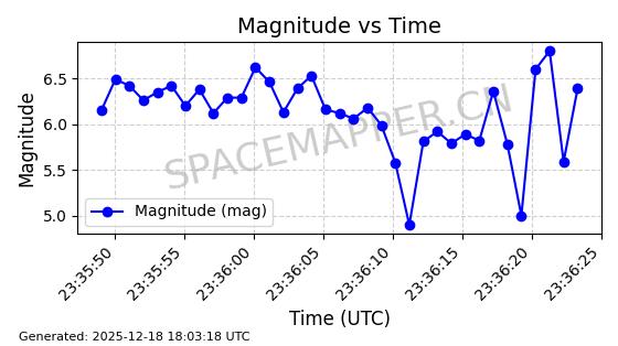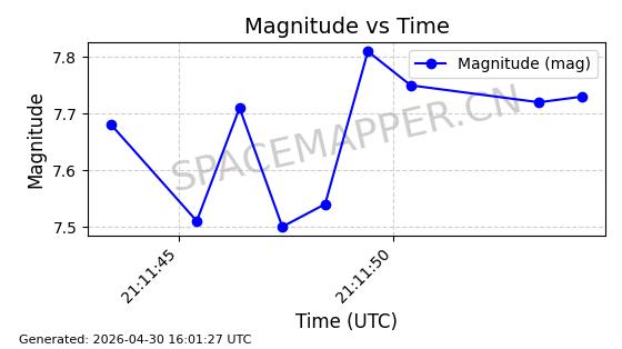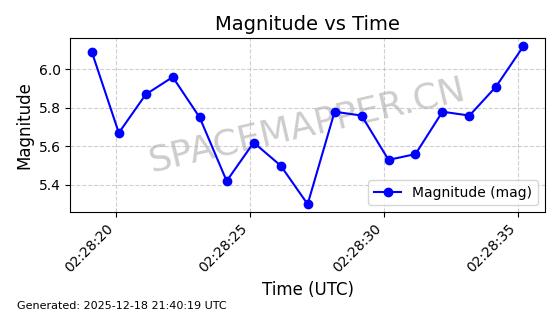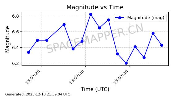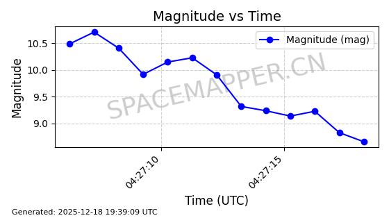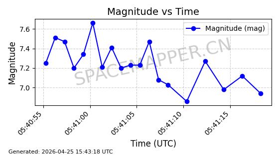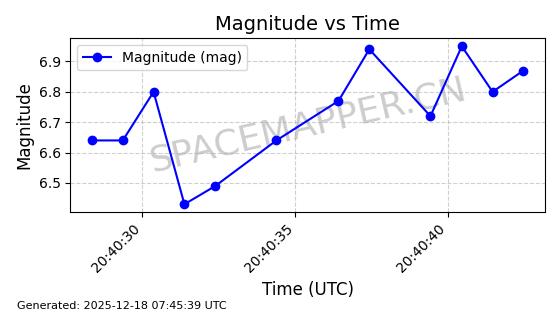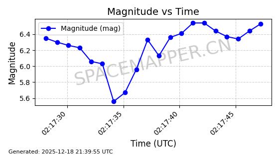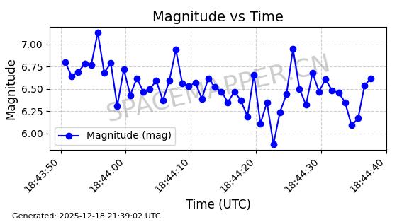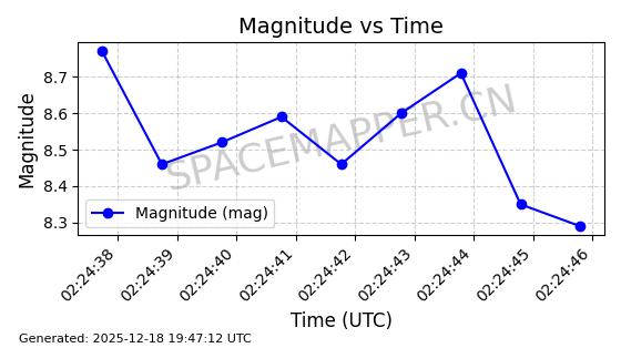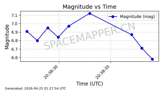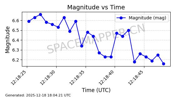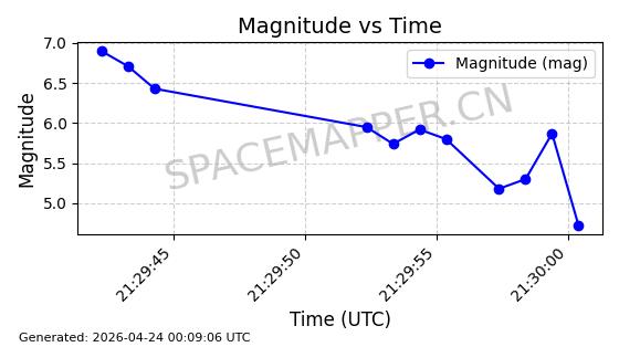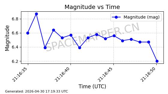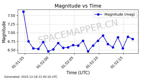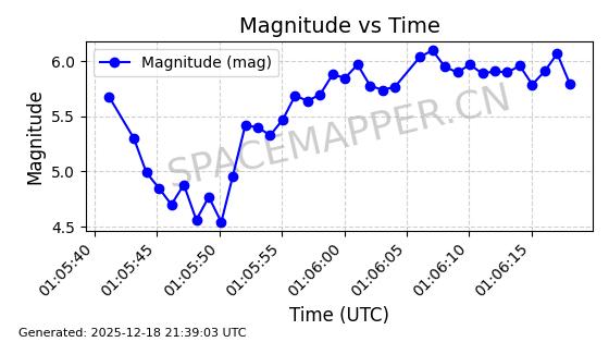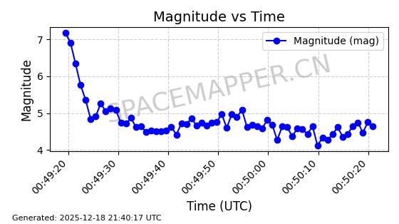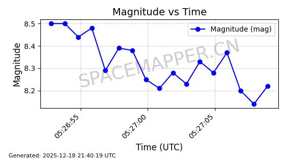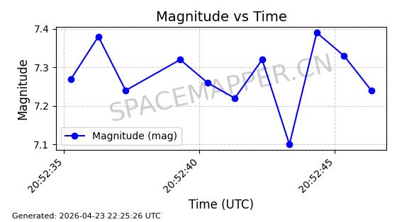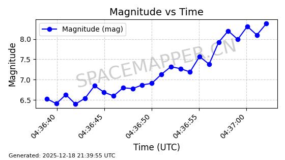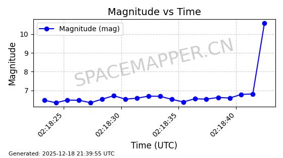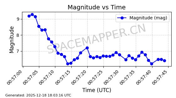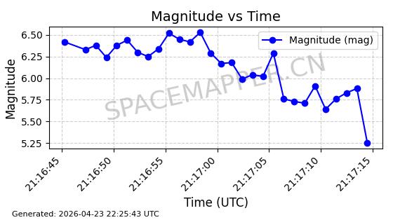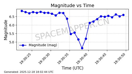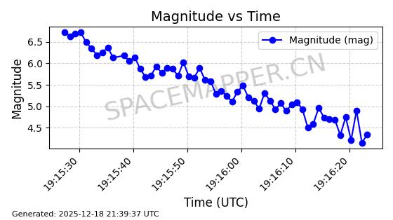 | STARLINK-30211 | 57304 | 57304 | 2023-07-10 同日期轨道 2023-096Q 同批次轨道 | 已陨落 | 88分钟 | 42.9779 | 179.698 | 217.02 | 0.0028374 | 2025-06-28 20:45:36 | ||