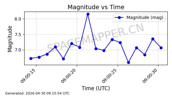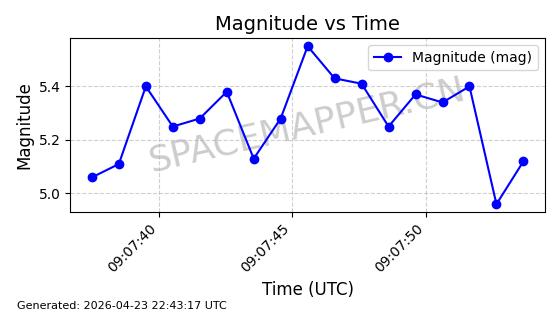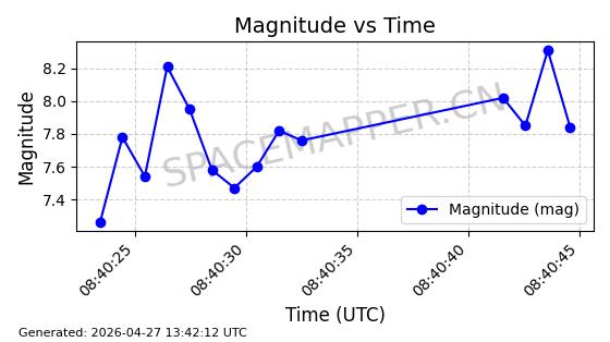 | STARLINK-30187 | 57473 | 57473 | 2023-07-28 同日期轨道 2023-107S 同批次轨道 | 已陨落 | 89分钟 | 42.9814 | 222.205 | 237.529 | 0.0011595 | 2026-04-08 09:49:44 | ||