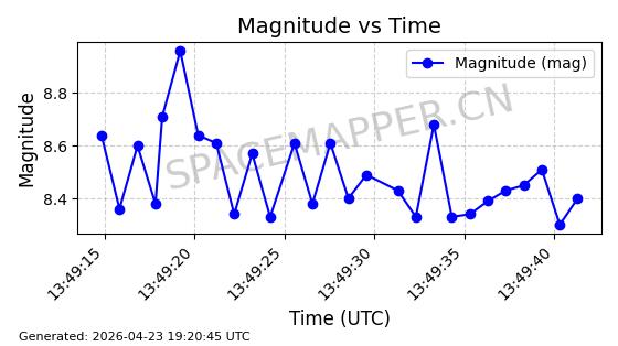 | STARLINK-30253 | 57525 | 57525 | 2023-08-08 同日期轨道 2023-115E 同批次轨道 | 在轨 | 94分钟 | 43.0054 | 482.567 | 483.567 | 0.0000728 | 2026-04-29 06:13:44 | ||