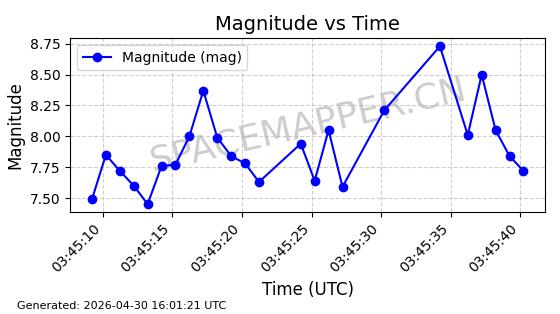 | 卫星名称 | AOE ID | NORAD ID | 发射日期 国际编号 | 在轨状态 | 轨道周期 | 轨道倾角 (度) | 近地点 (Km) | 远地点 (Km) | 偏心率 | 更新时间 (UTC) | 近期光变曲线 | 服务 |