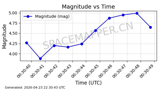 | STARLINK-30213 | 57504 | 57504 | 2023-08-07 同日期轨道 2023-113K 同批次轨道 | 在轨 | 94分钟 | 43.0041 | 482.02 | 484.11 | 0.0001523 | 2026-04-29 06:03:47 | ||