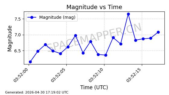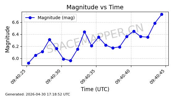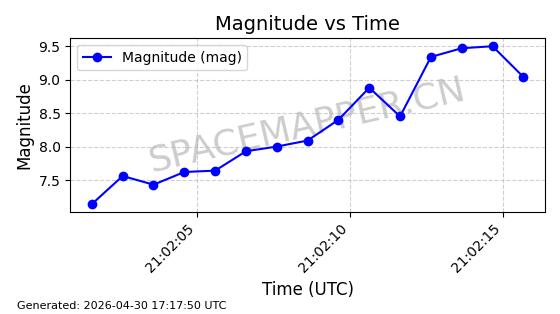 | STARLINK-30221 | 57418 | 57418 | 2023-07-20 同日期轨道 2023-102Q 同批次轨道 | 在轨 | 95分钟 | 43.0007 | 509.749 | 512.451 | 0.0001961 | 2026-04-29 06:00:03 | ||