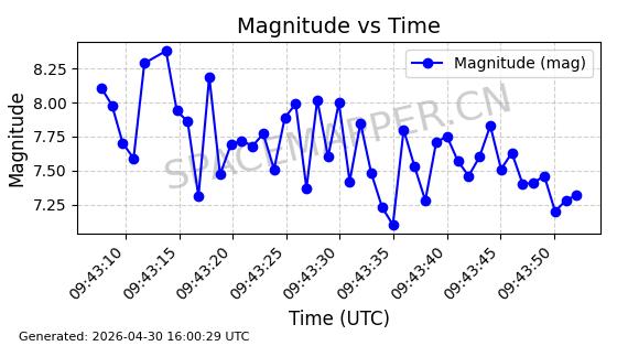 | STARLINK-30164 | 57500 | 57500 | 2023-08-07 同日期轨道 2023-113F 同批次轨道 | 在轨 | 94分钟 | 43.0023 | 482.047 | 484.053 | 0.0001461 | 2026-04-29 06:55:23 | ||