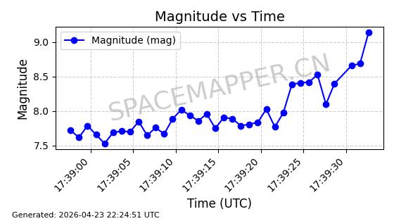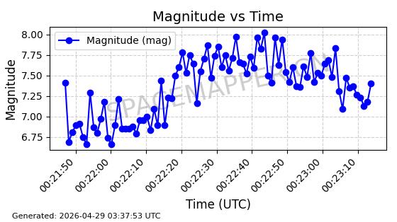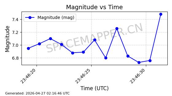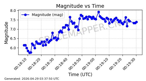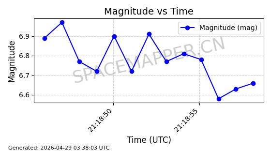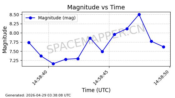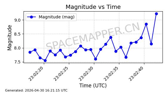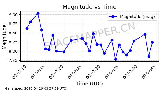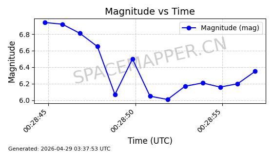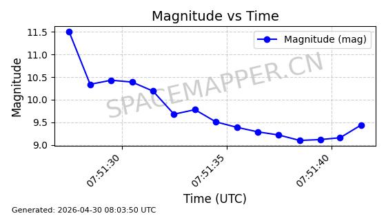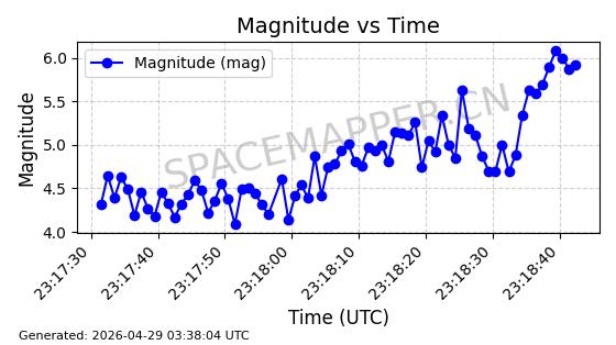 | STARLINK-30351 | 57738 | 57738 | 2023-09-01 同日期轨道 2023-131G 同批次轨道 | 在轨 | 94分钟 | 43.0014 | 482.239 | 483.827 | 0.0001157 | 2026-04-29 01:37:26 | ||
