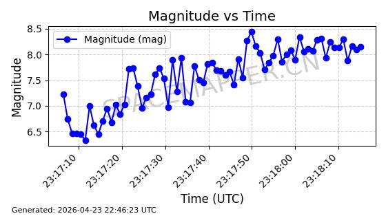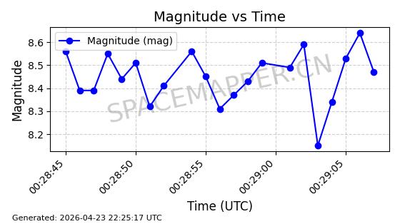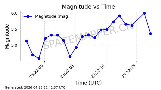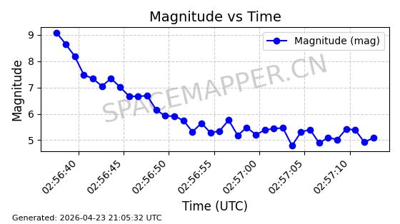 | STARLINK-30322 | 57670 | 57670 | 2023-08-22 同日期轨道 2023-124H 同批次轨道 | 在轨 | 94分钟 | 53.1614 | 474.452 | 475.882 | 0.0001042 | 2026-04-28 23:53:47 | ||