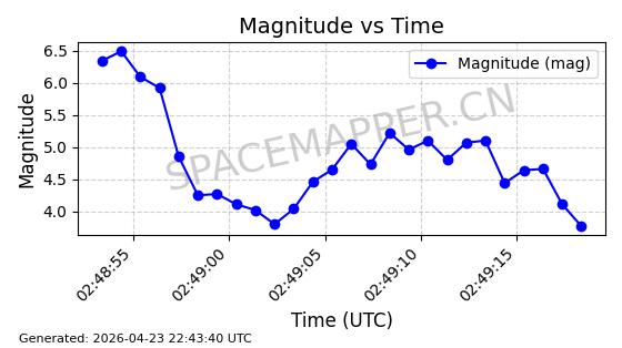 | STARLINK-30302 | 57664 | 57664 | 2023-08-22 同日期轨道 2023-124B 同批次轨道 | 已陨落 | 88分钟 | 53.1263 | 172.048 | 179.688 | 0.0005828 | 2025-02-27 11:36:01 | ![]() | |