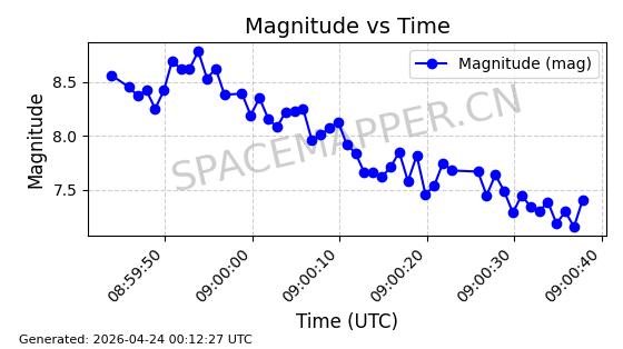 | STARLINK-30271 | 57669 | 57669 | 2023-08-22 同日期轨道 2023-124G 同批次轨道 | 在轨 | 94分钟 | 53.1600 | 470.272 | 471.364 | 0.0000796 | 2026-04-29 00:00:02 | ||