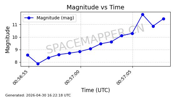 | STARLINK-30326 | 57639 | 57639 | 2023-08-17 同日期轨道 2023-122H 同批次轨道 | 在轨 | 94分钟 | 42.9969 | 482.069 | 484.073 | 0.0001459 | 2026-04-29 03:31:32 | ||