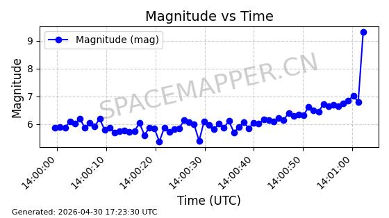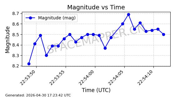 | STARLINK-30414 | 57859 | 57859 | 2023-09-12 同日期轨道 2023-141V 同批次轨道 | 在轨 | 94分钟 | 53.1618 | 474.291 | 476.205 | 0.0001396 | 2026-04-30 02:36:01 | ||