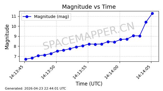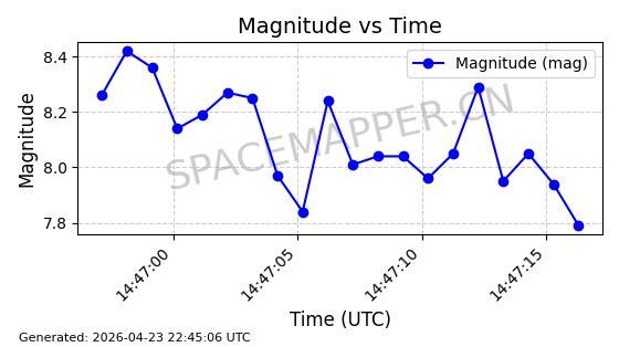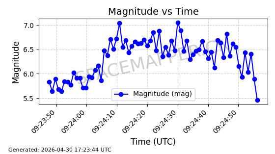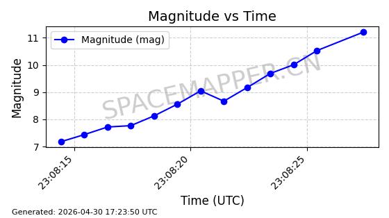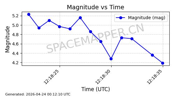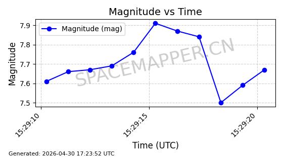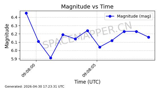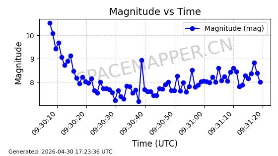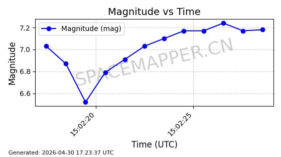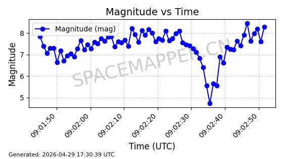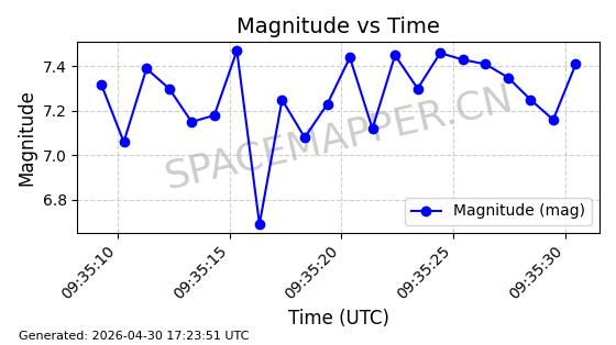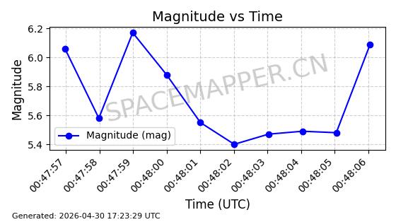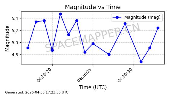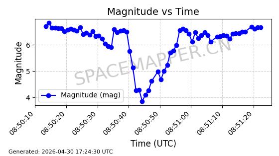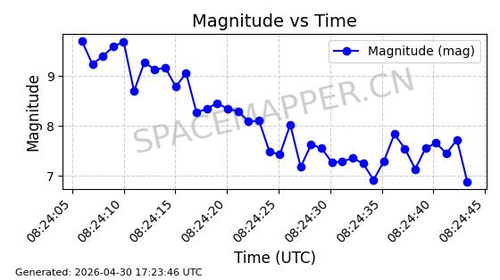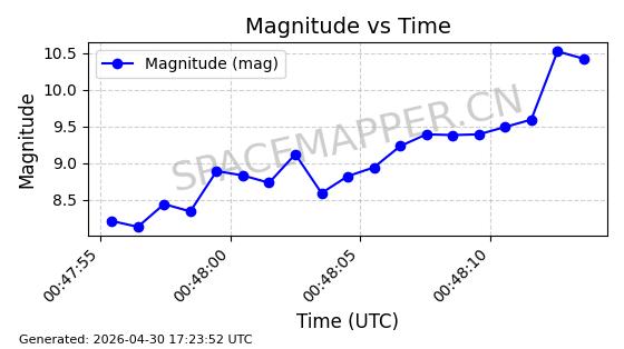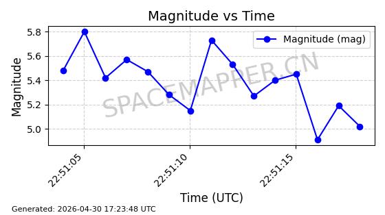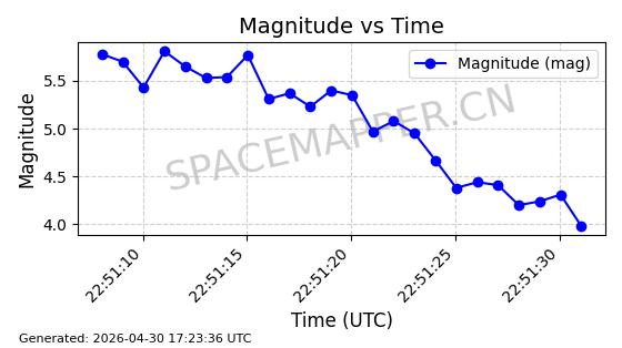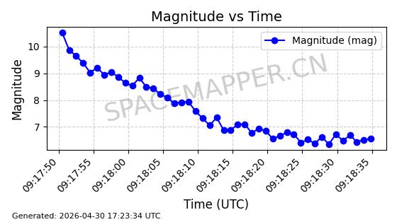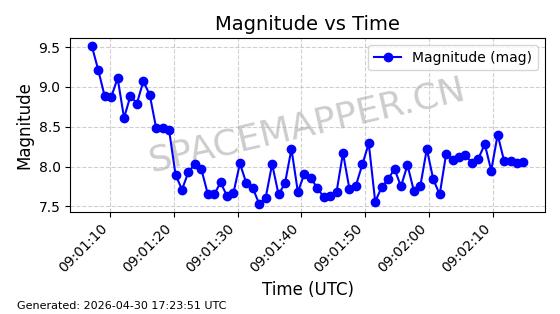 | STARLINK-30405 | 57851 | 57851 | 2023-09-12 同日期轨道 2023-141M 同批次轨道 | 在轨 | 94分钟 | 53.1605 | 470.132 | 471.526 | 0.0001017 | 2026-04-30 04:00:01 | ||
