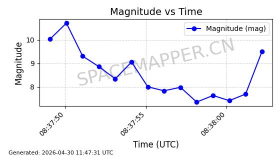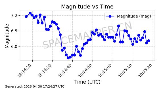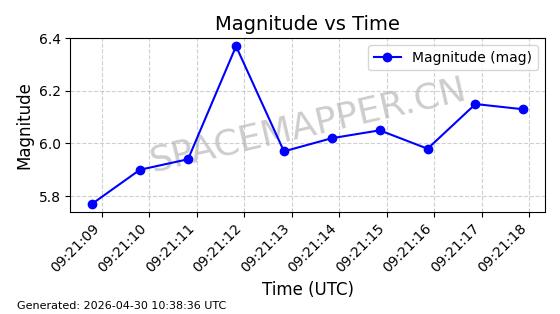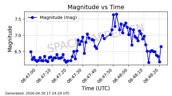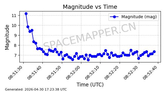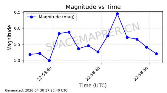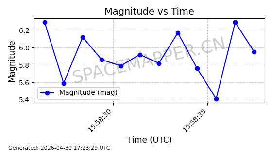 | STARLINK-30421 | 58107 | 58107 | 2023-10-21 同日期轨道 2023-161L 同批次轨道 | 在轨 | 94分钟 | 53.1596 | 464.84 | 466.452 | 0.0001177 | 2026-04-30 04:00:01 |