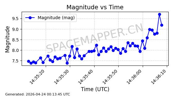 | STARLINK-30425 | 57850 | 57850 | 2023-09-12 同日期轨道 2023-141L 同批次轨道 | 在轨 | 94分钟 | 53.1624 | 474.4 | 476.06 | 0.0001211 | 2026-04-30 02:13:19 | ||