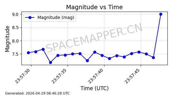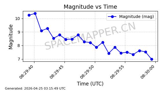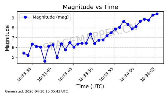 | STARLINK-30388 | 57784 | 57784 | 2023-09-04 同日期轨道 2023-134P 同批次轨道 | 在轨 | 94分钟 | 43.0041 | 481.974 | 484.15 | 0.0001585 | 2026-04-29 20:25:17 | ||
