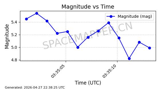 | STARLINK-30438 | 58035 | 58035 | 2023-10-09 同日期轨道 2023-156H 同批次轨道 | 在轨 | 94分钟 | 53.1588 | 474.521 | 475.981 | 0.0001064 | 2026-04-29 22:08:08 | ||