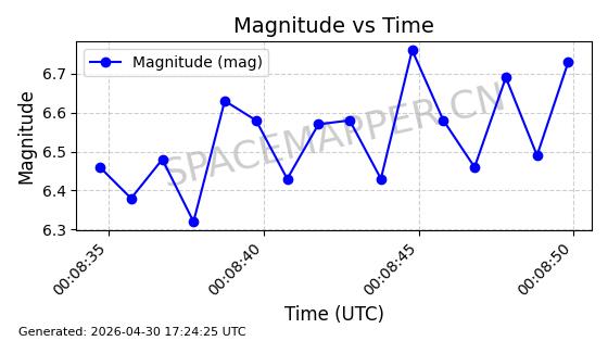 | 卫星名称 | AOE ID | NORAD ID | 发射日期 国际编号 | 在轨状态 | 轨道周期 | 轨道倾角 (度) | 近地点 (Km) | 远地点 (Km) | 偏心率 | 更新时间 (UTC) | 近期光变曲线 | 服务 |