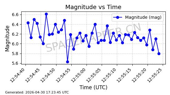 | STARLINK-30412 | 57854 | 57854 | 2023-09-12 同日期轨道 2023-141Q 同批次轨道 | 在轨 | 94分钟 | 53.1614 | 474.429 | 476.053 | 0.0001184 | 2026-04-30 04:05:30 | ||