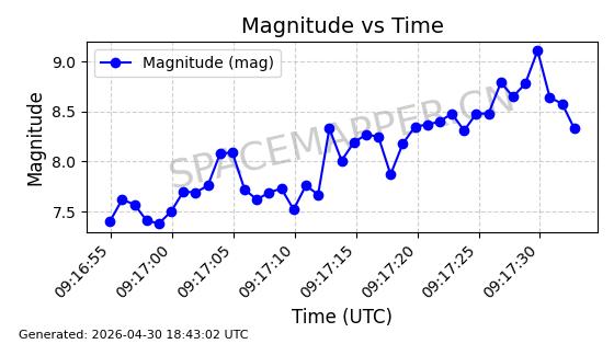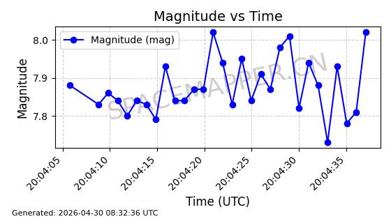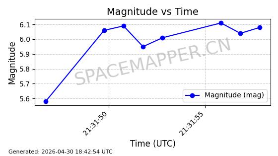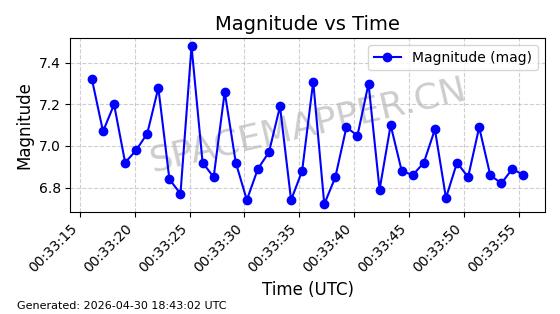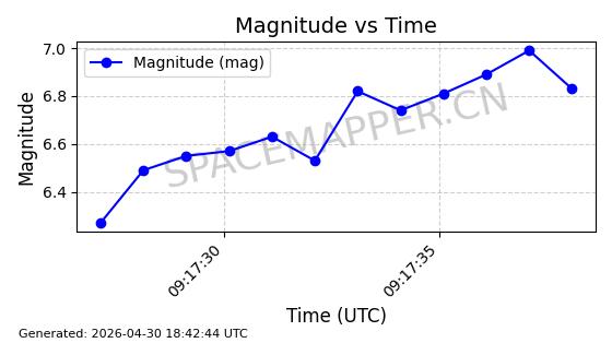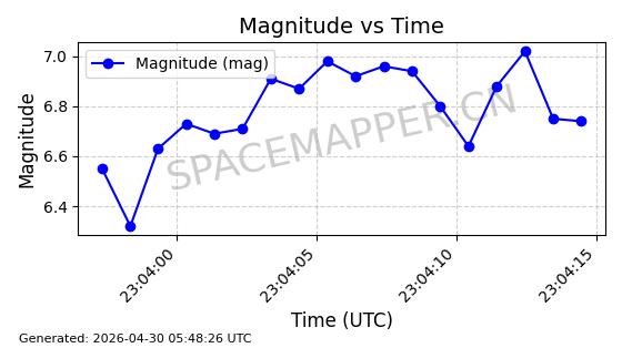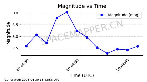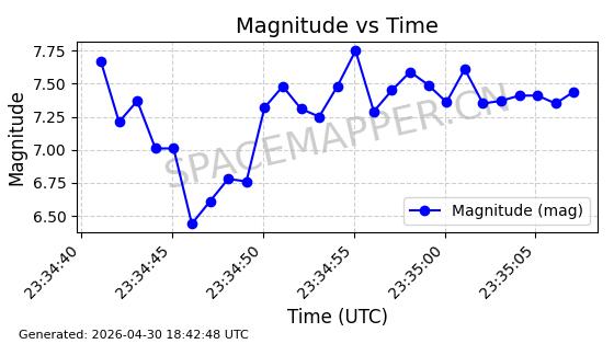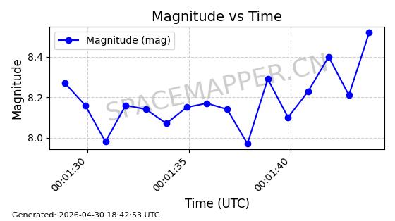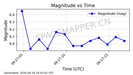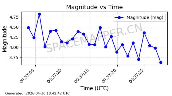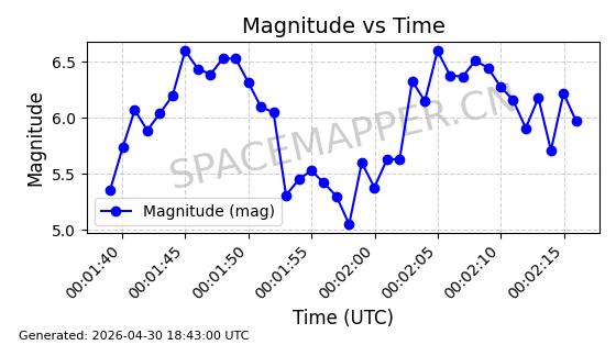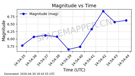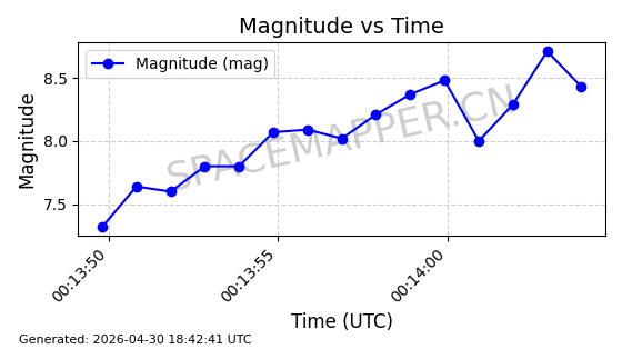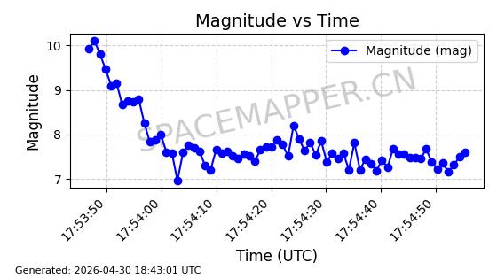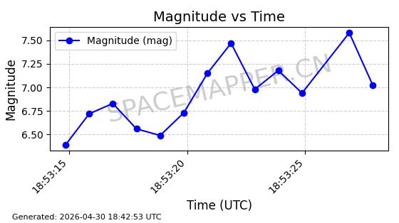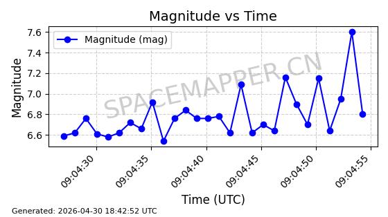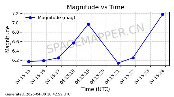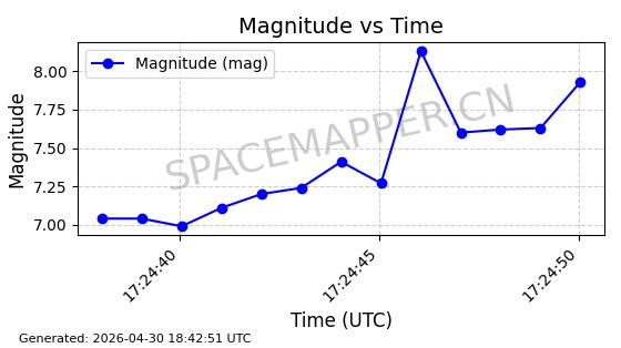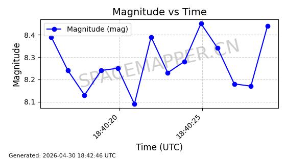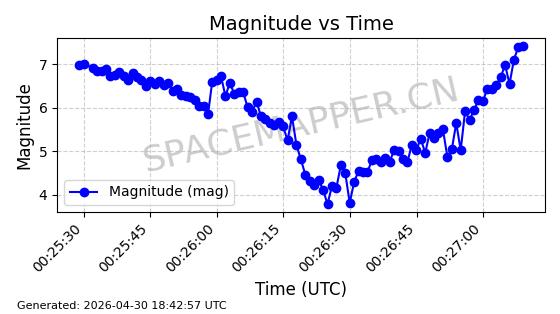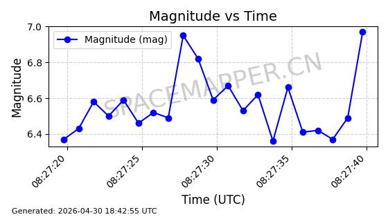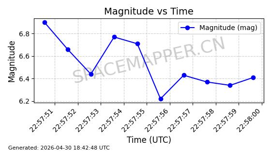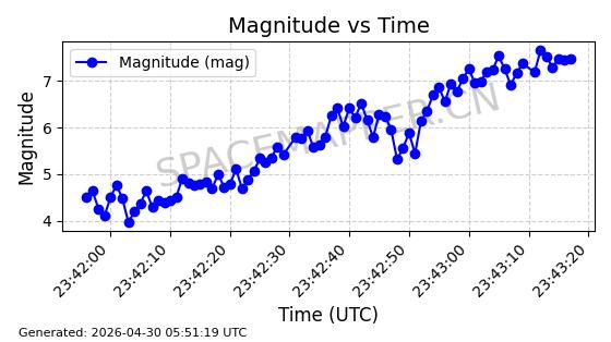 | STARLINK-30757 | 58131 | 58131 | 2023-10-22 同日期轨道 2023-162P 同批次轨道 | 在轨 | 94分钟 | 43.0044 | 482.381 | 483.755 | 0.0001000 | 2026-04-30 04:44:31 | ||