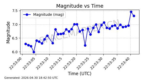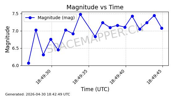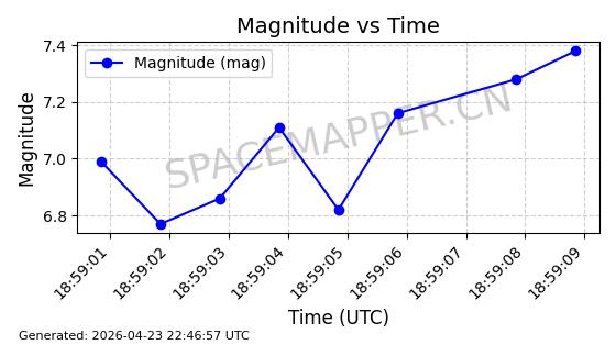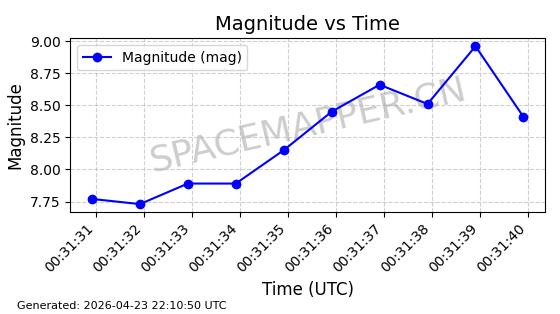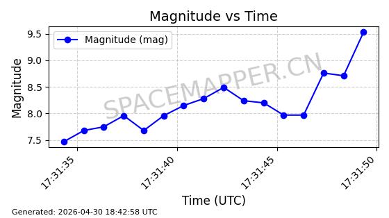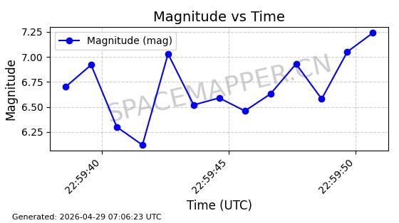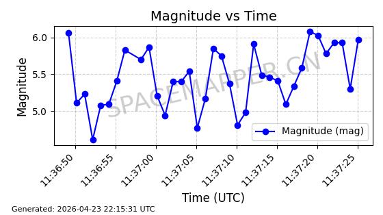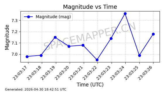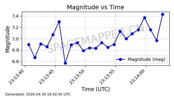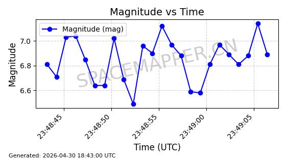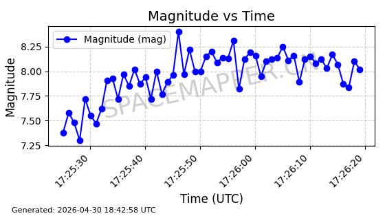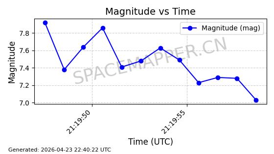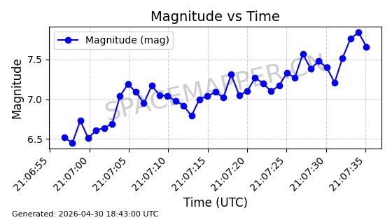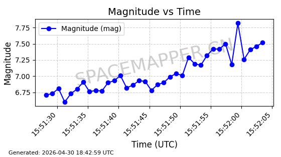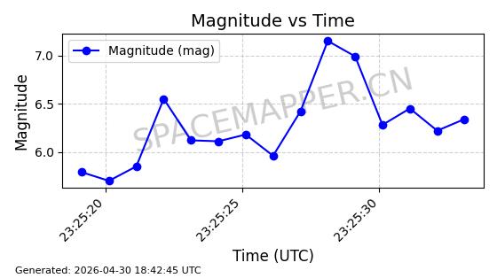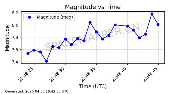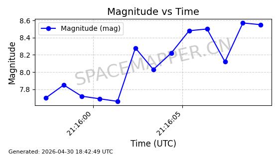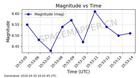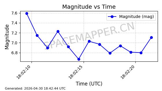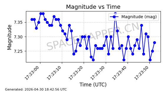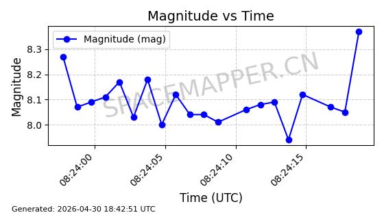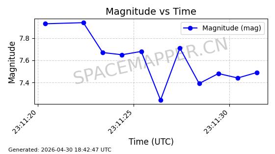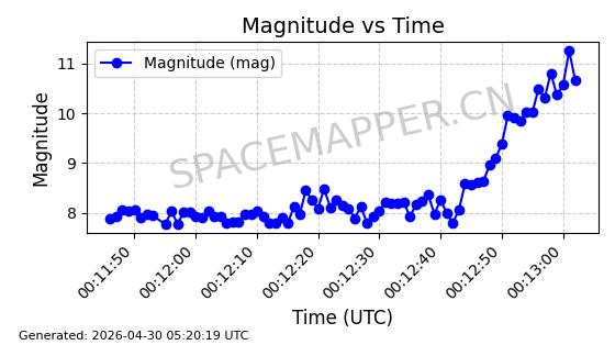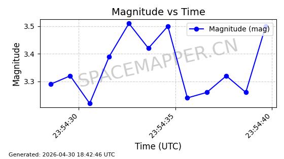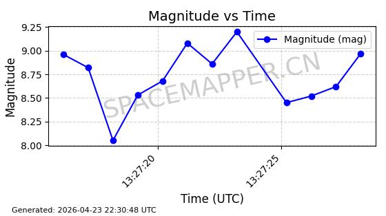 | STARLINK-30757 | 58131 | 58131 | 2023-10-22 同日期轨道 2023-162P 同批次轨道 | 在轨 | 94分钟 | 43.0044 | 482.381 | 483.755 | 0.0001000 | 2026-04-30 04:44:31 | ||