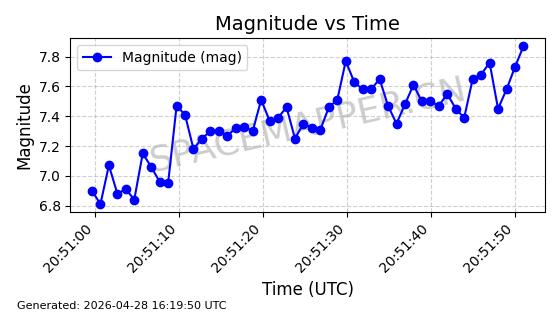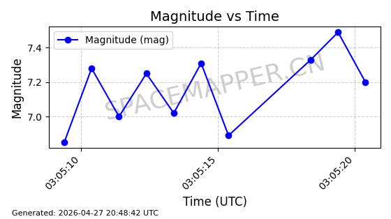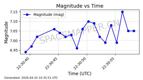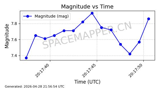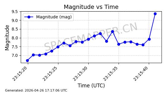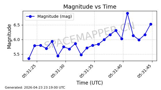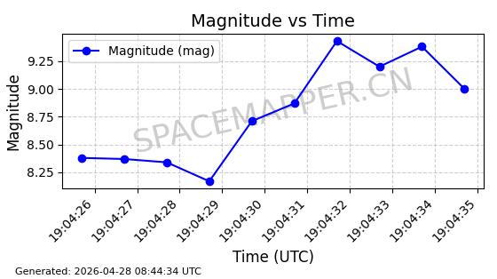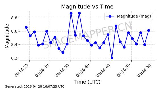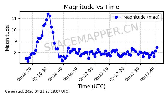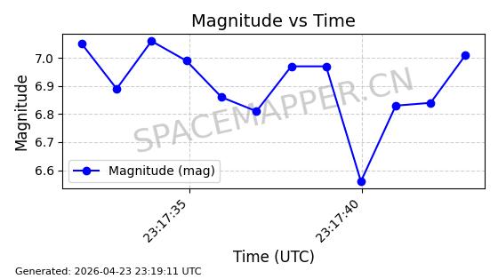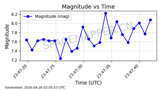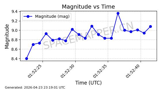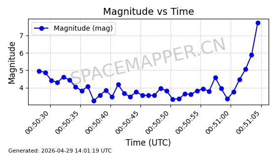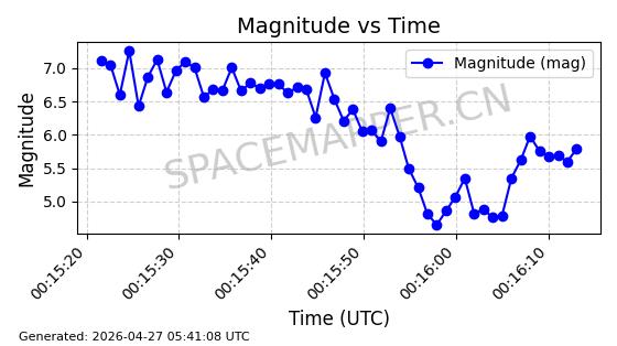 | STARLINK-30752 | 58171 | 58171 | 2023-10-29 同日期轨道 2023-166X 同批次轨道 | 在轨 | 94分钟 | 53.1612 | 474.534 | 475.898 | 0.0000994 | 2026-04-29 21:49:44 | ||