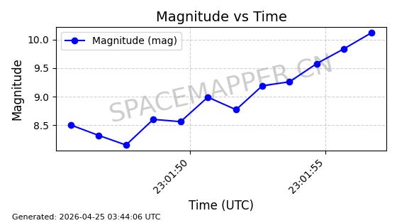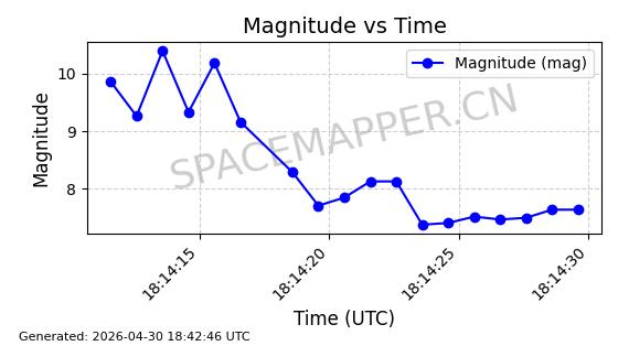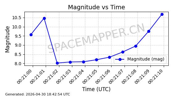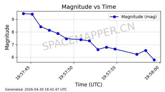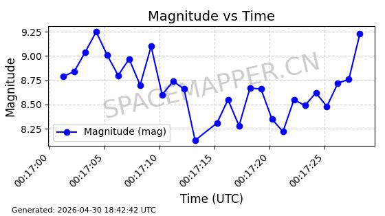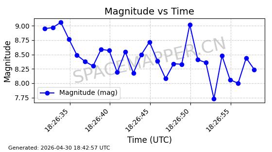 | STARLINK-30582 | 58059 | 58059 | 2023-10-13 同日期轨道 2023-158J 同批次轨道 | 在轨 | 94分钟 | 42.9992 | 482.267 | 483.889 | 0.0001182 | 2026-04-30 00:20:09 | ||