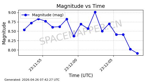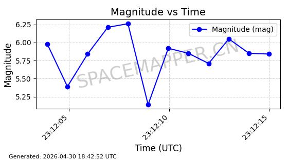 | STARLINK-30563 | 58042 | 58042 | 2023-10-09 同日期轨道 2023-156Q 同批次轨道 | 在轨 | 94分钟 | 53.1580 | 474.615 | 475.849 | 0.0000899 | 2026-04-30 04:15:57 | ||