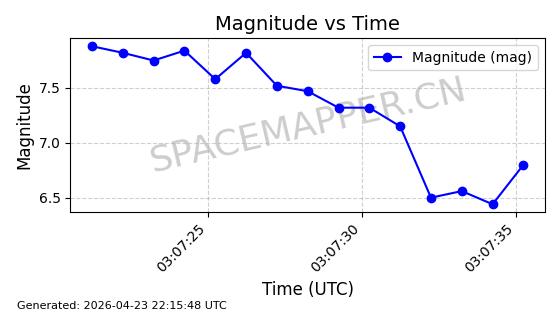 | STARLINK-30754 | 58124 | 58124 | 2023-10-22 同日期轨道 2023-162G 同批次轨道 | 在轨 | 94分钟 | 42.9978 | 481.866 | 484.202 | 0.0001701 | 2026-04-29 22:12:22 | ||