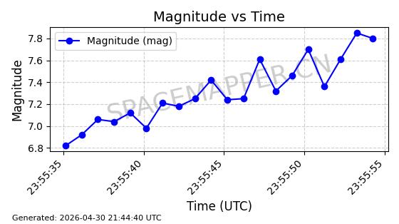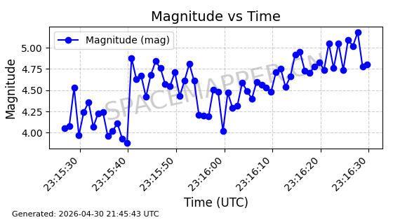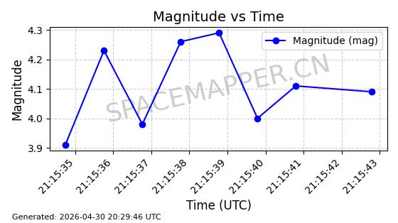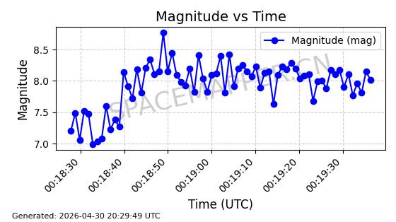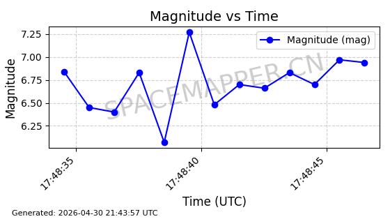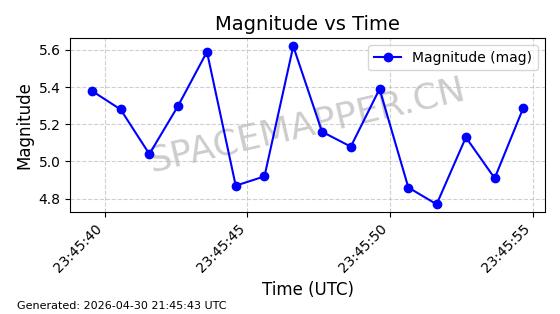 | STARLINK-30966 | 58454 | 58454 | 2023-11-28 同日期轨道 2023-183T 同批次轨道 | 在轨 | 94分钟 | 43.0011 | 482.407 | 483.723 | 0.0000959 | 2026-04-30 00:08:23 | ||