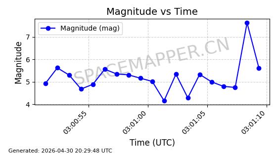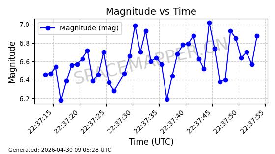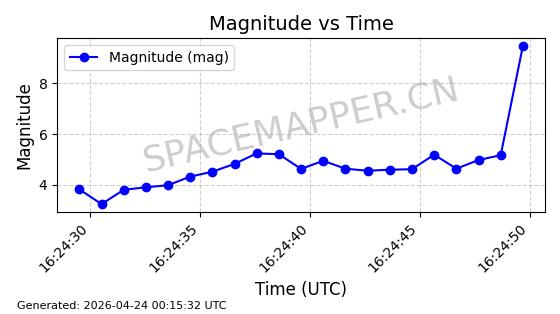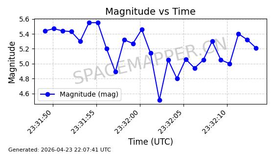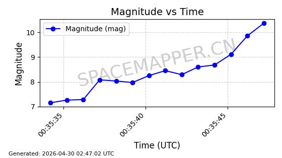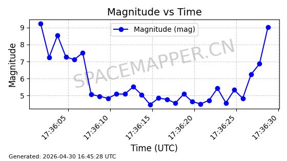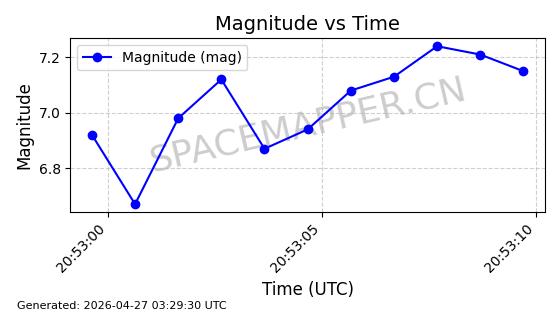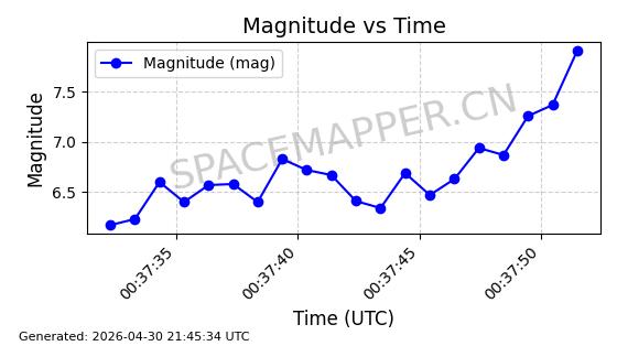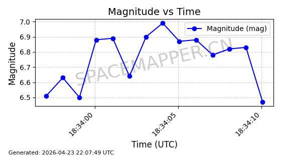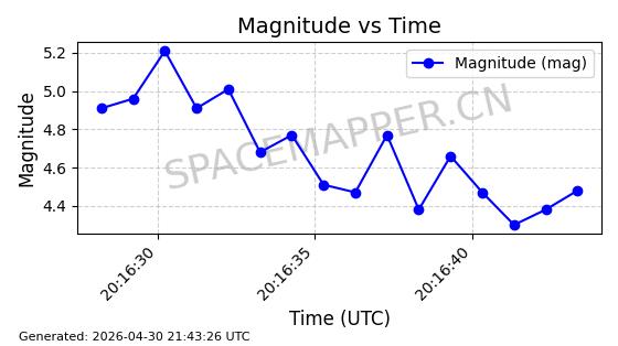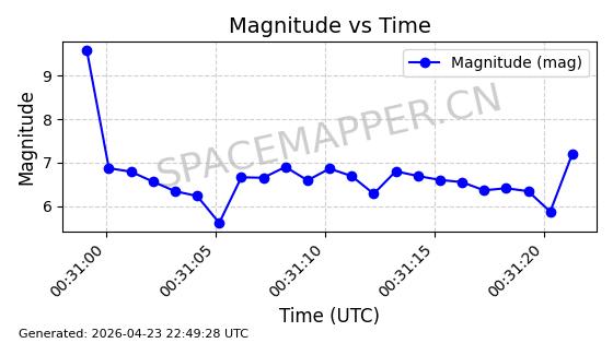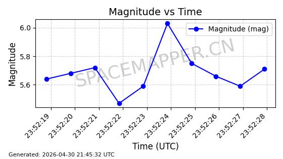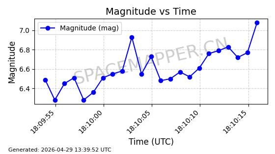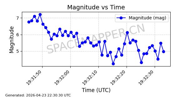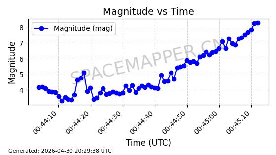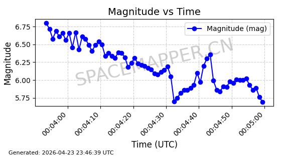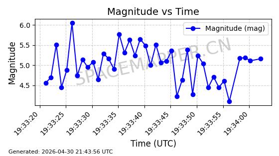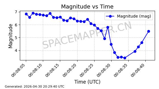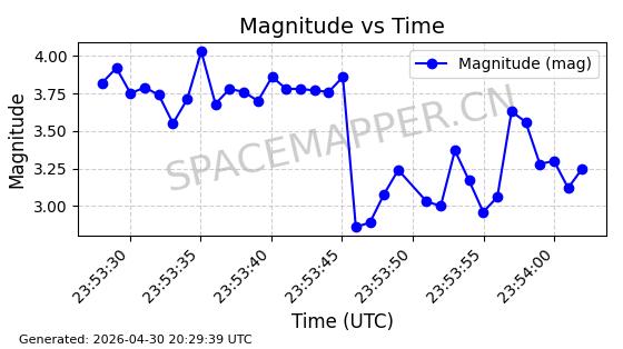 | STARLINK-31007 | 58889 | 58889 | 2024-01-29 同日期轨道 2024-020P 同批次轨道 | 在轨 | 94分钟 | 53.1604 | 474.412 | 476.05 | 0.0001194 | 2026-04-30 02:43:00 | ||