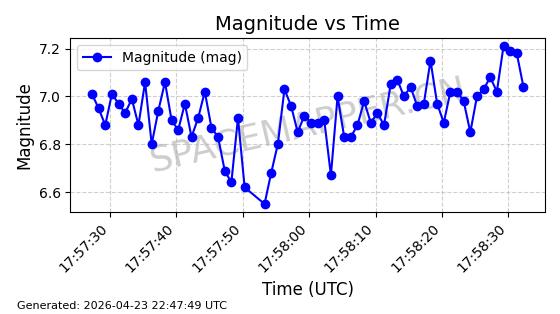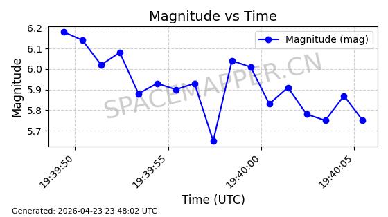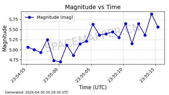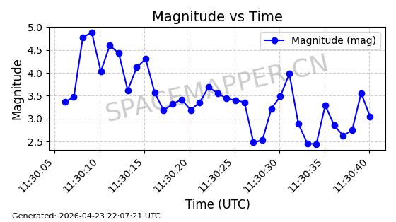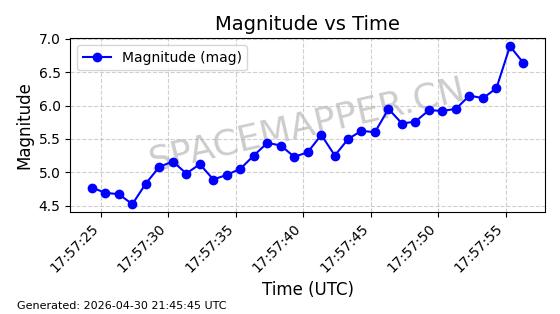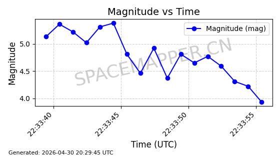 | STARLINK-30976 | 58447 | 58447 | 2023-11-28 同日期轨道 2023-183L 同批次轨道 | 在轨 | 94分钟 | 42.9972 | 482.439 | 483.651 | 0.0000883 | 2026-04-30 00:15:47 | ||