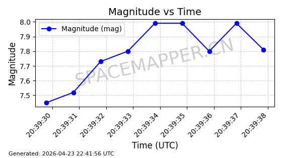 | STARLINK-30967 | 58416 | 58416 | 2023-11-22 同日期轨道 2023-180Q 同批次轨道 | 在轨 | 94分钟 | 43.0031 | 481.863 | 484.179 | 0.0001687 | 2026-04-30 00:04:36 | ||