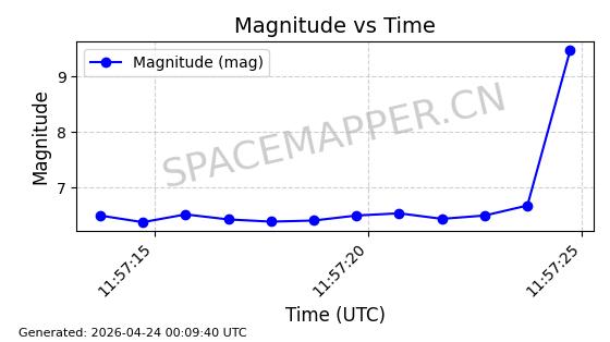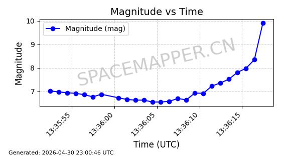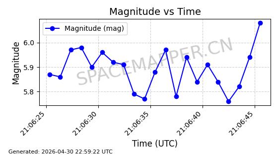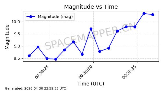 | STARLINK-31217 | 59036 | 59036 | 2024-02-25 同日期轨道 2024-038P 同批次轨道 | 在轨 | 94分钟 | 43.0032 | 482.001 | 484.099 | 0.0001528 | 2026-04-30 00:56:25 | ||
