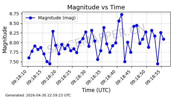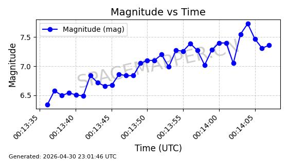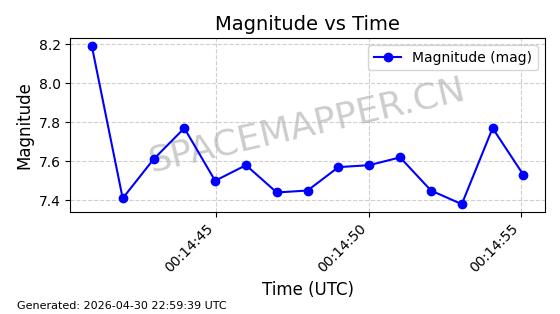 | STARLINK-31170 | 58801 | 58801 | 2024-01-15 同日期轨道 2024-012Q 同批次轨道 | 在轨 | 94分钟 | 43.0003 | 481.732 | 484.294 | 0.0001866 | 2026-04-30 00:10:13 | ||