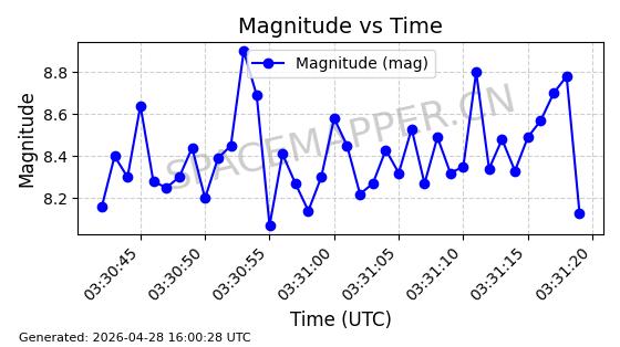 | STARLINK-31206 | 59028 | 59028 | 2024-02-25 同日期轨道 2024-038F 同批次轨道 | 在轨 | 94分钟 | 43.0045 | 482.929 | 483.153 | 0.0000162 | 2026-04-30 03:12:43 | ||