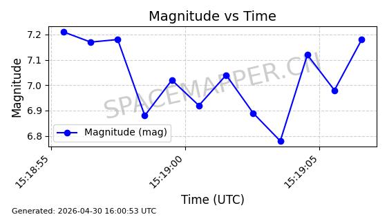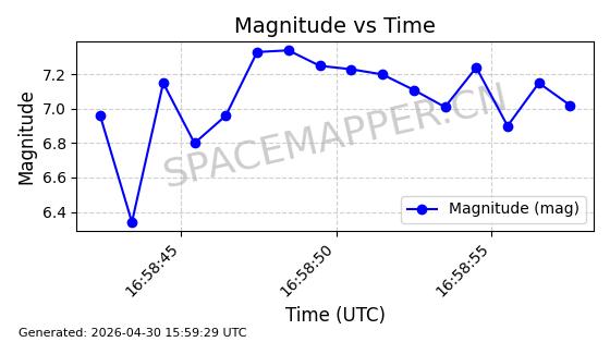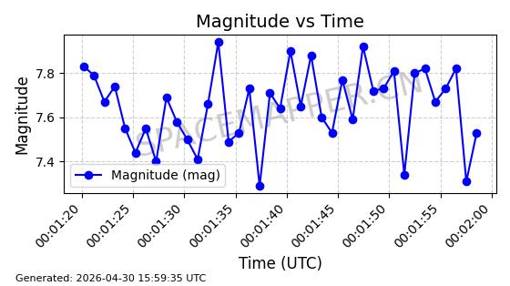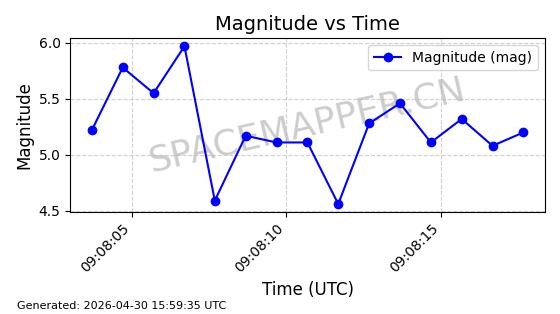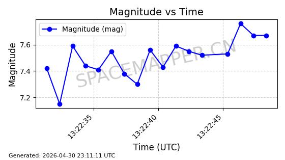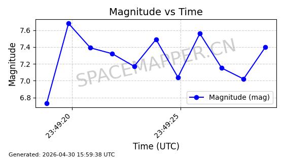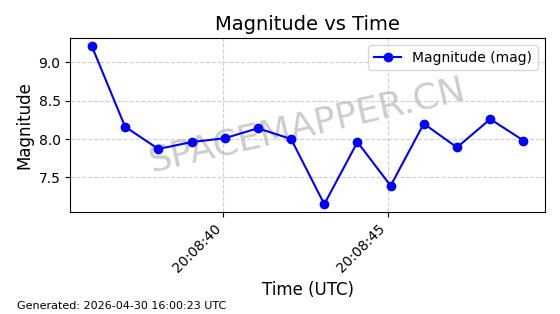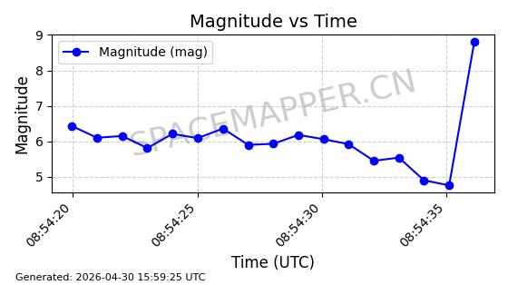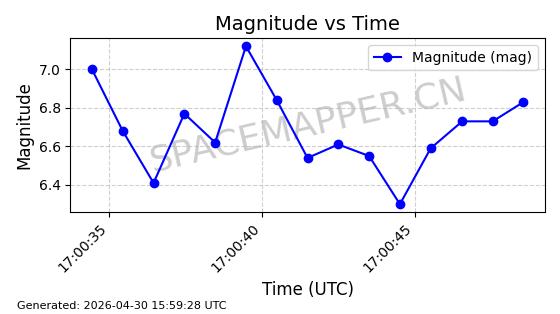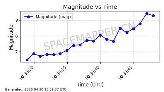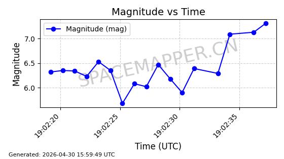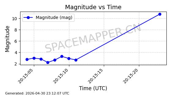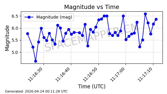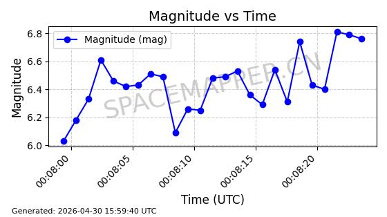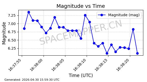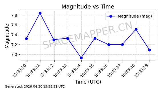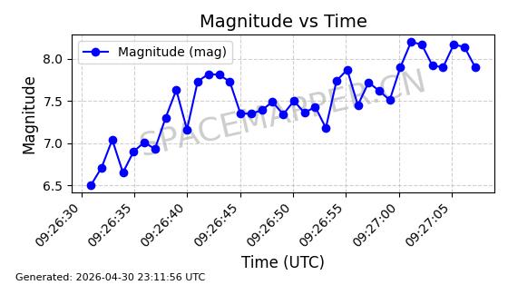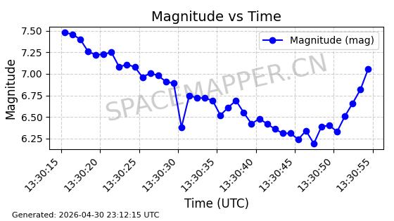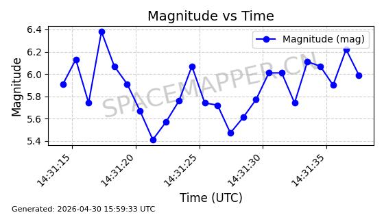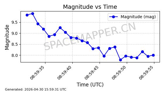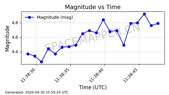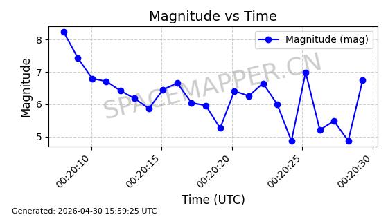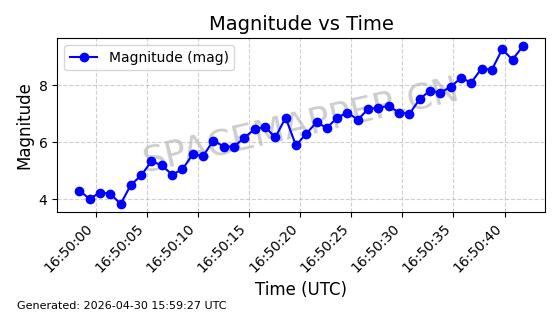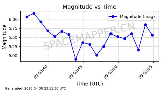 | STARLINK-31415 | 59419 | 59419 | 2024-04-05 同日期轨道 2024-064X 同批次轨道 | 在轨 | 94分钟 | 43.0002 | 482.116 | 484.012 | 0.0001381 | 2026-04-30 00:50:12 | ||