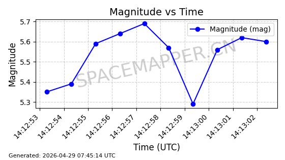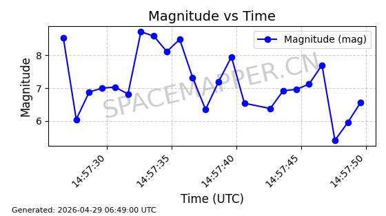 | STARLINK-31416 | 59355 | 59355 | 2024-03-31 同日期轨道 2024-060H 同批次轨道 | 在轨 | 94分钟 | 42.9984 | 482.445 | 483.693 | 0.0000909 | 2026-04-29 07:23:43 | ||