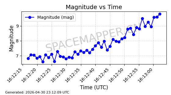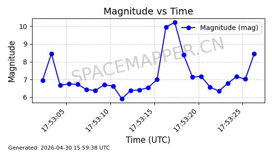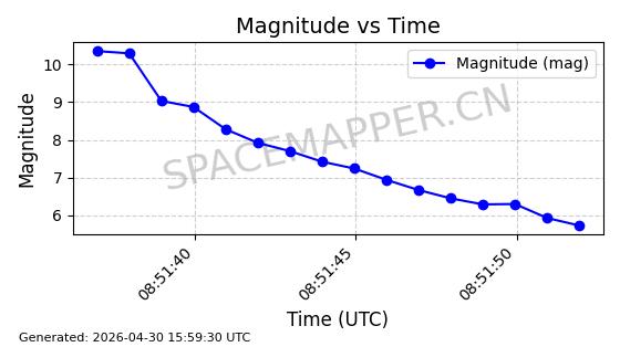 | STARLINK-31334 | 59157 | 59157 | 2024-03-04 同日期轨道 2024-044F 同批次轨道 | 在轨 | 94分钟 | 43.0011 | 482.54 | 483.498 | 0.0000698 | 2026-04-30 05:02:27 | ||