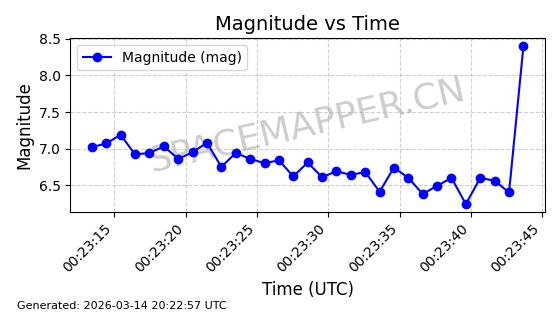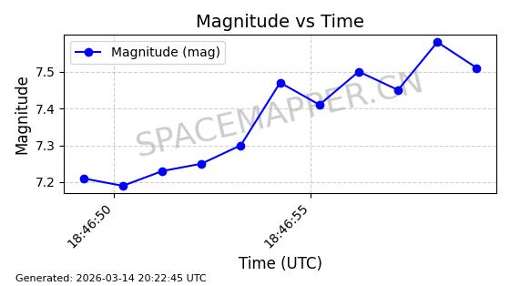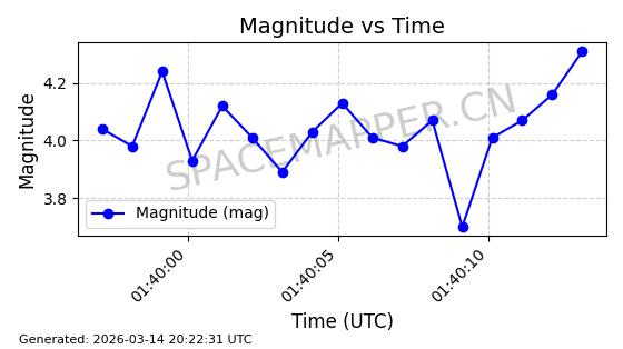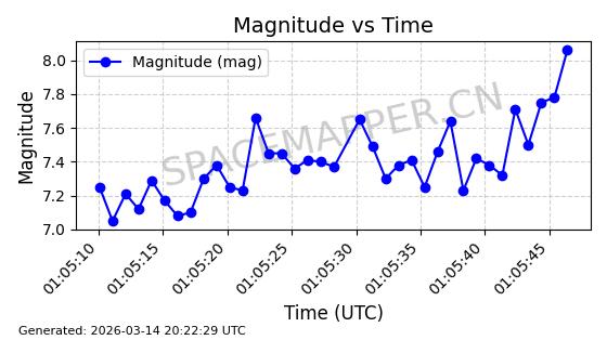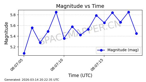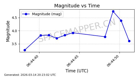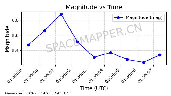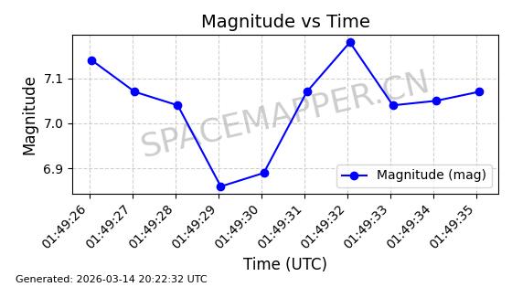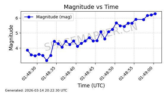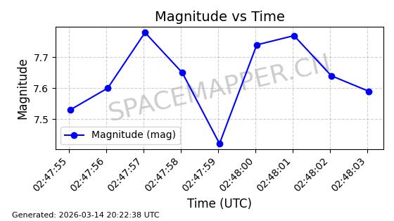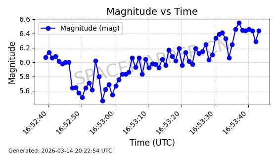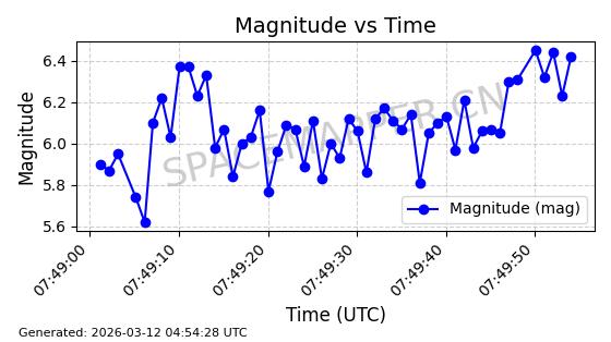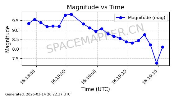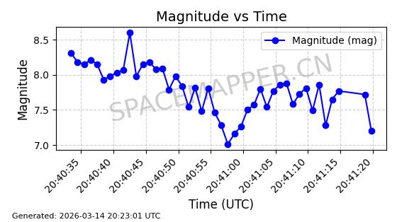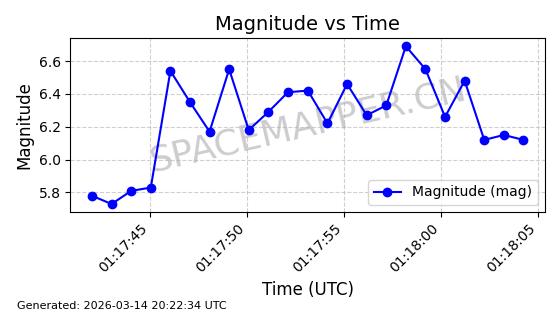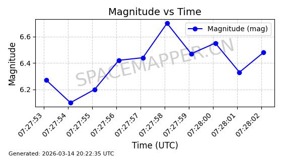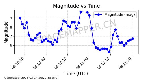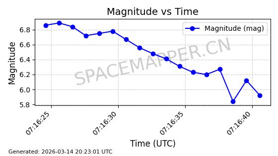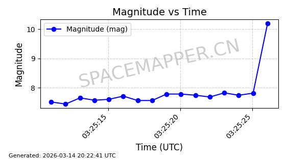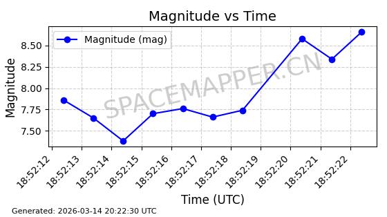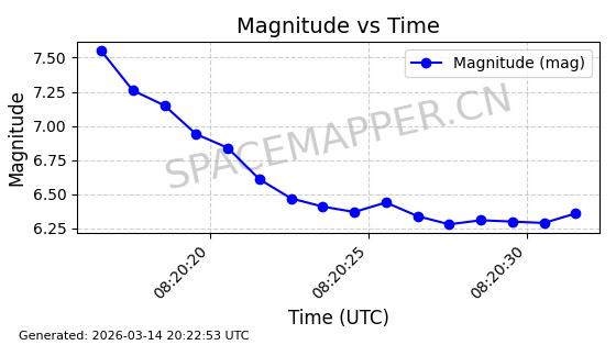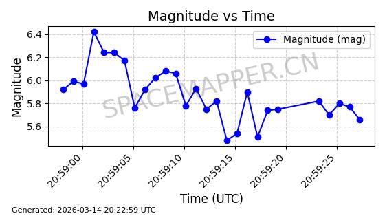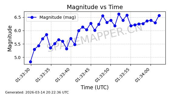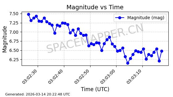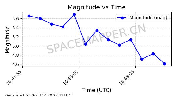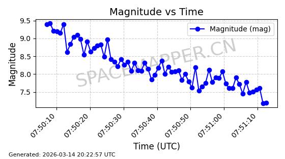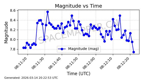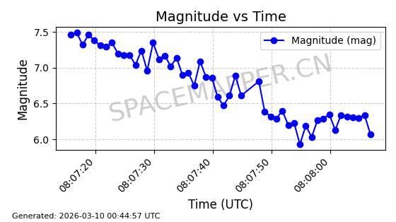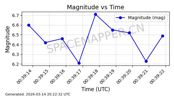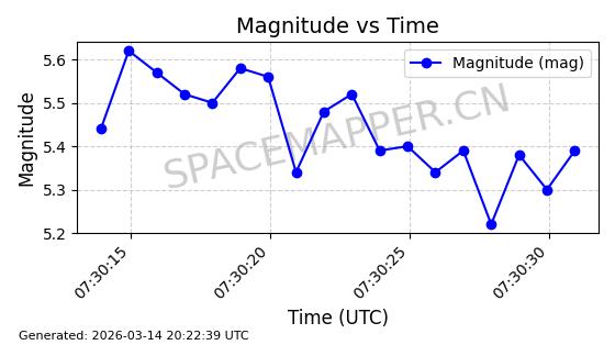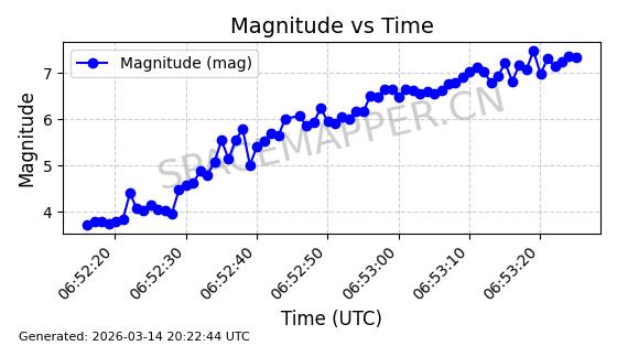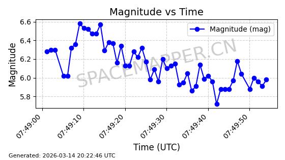 | STARLINK-4662 | 53738 | 53738 | 2022-09-05 同日期轨道 2022-107AQ 同批次轨道 | 在轨 | 95分钟 | 53.2170 | 538.85 | 540.674 | 0.0001318 | 2026-03-13 20:14:10 | ||