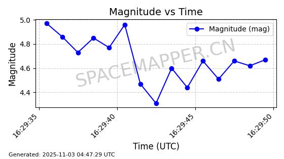 | STARLINK-31930 | 60596 | 60596 | 2024-08-20 同日期轨道 2024-150P 同批次轨道 | 在轨 | 94分钟 | 53.1601 | 474.265 | 476.265 | 0.0001459 | 2025-10-31 22:48:58 | ||