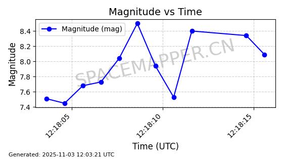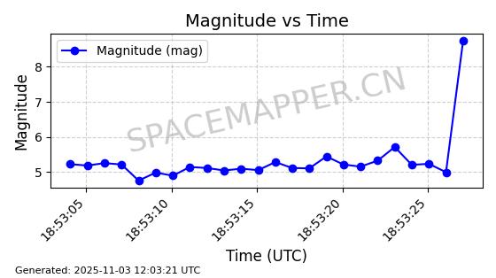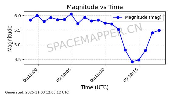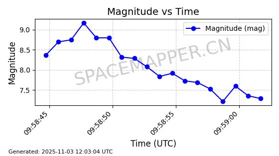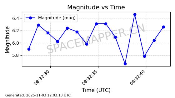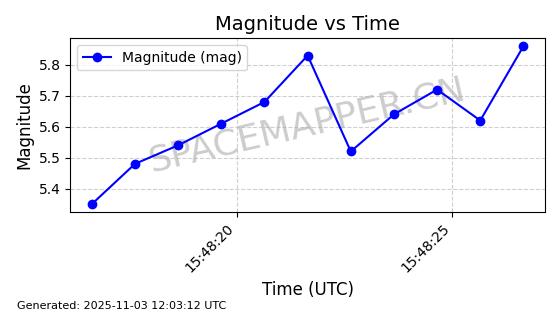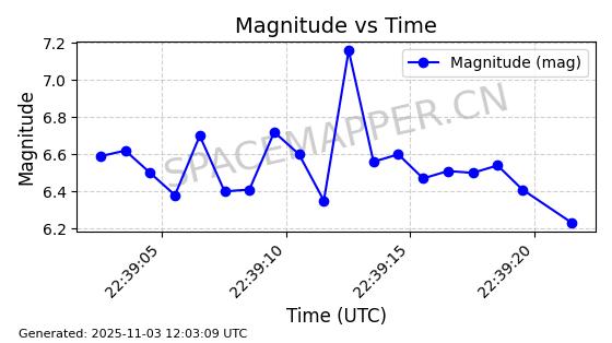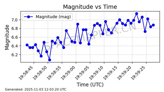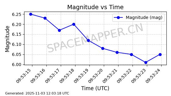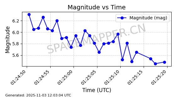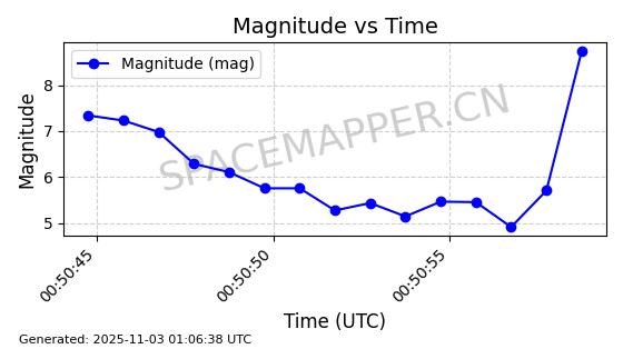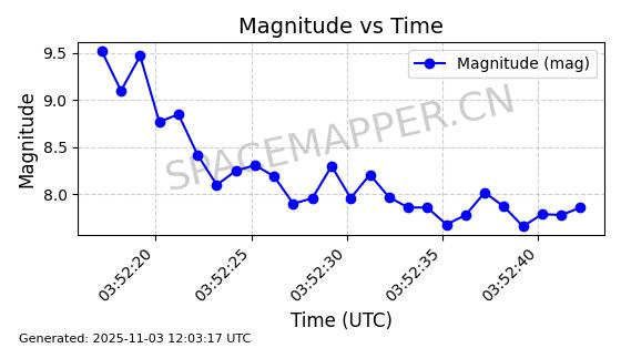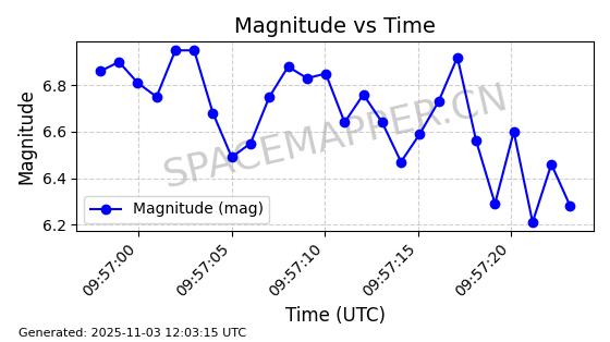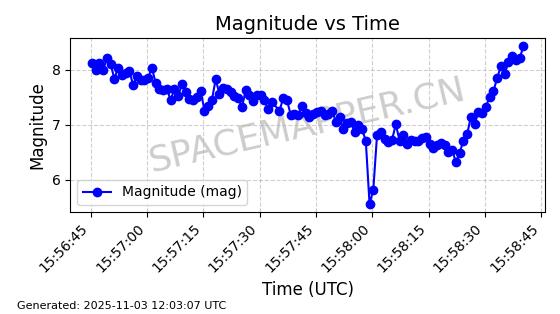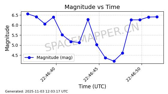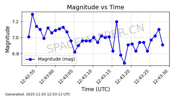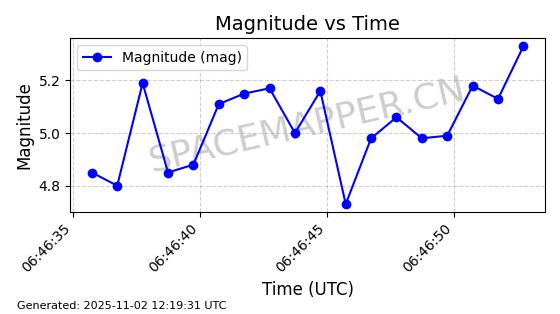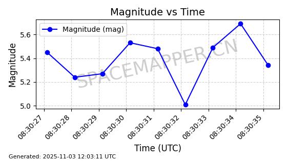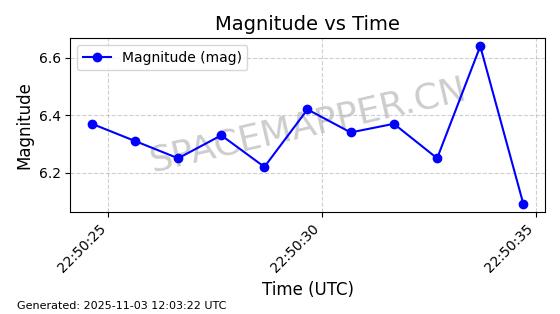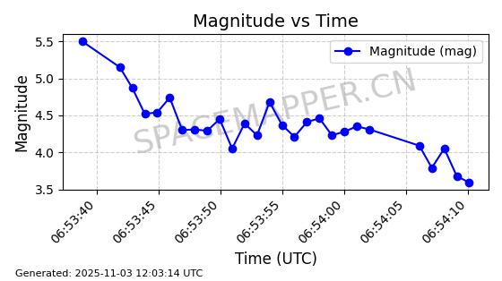| STARLINK-32280 | 60736 | 60736 | 2024-08-28 同日期轨道 2024-152S 同批次轨道 | 已陨落 | 88分钟 | 53.1203 | 186.634 | 198.748 | 0.0009218 | 2025-10-15 04:42:25 | ||