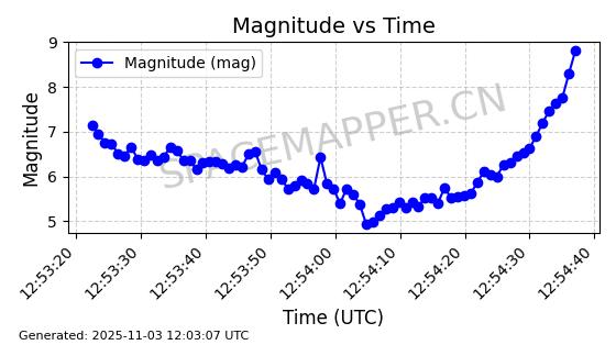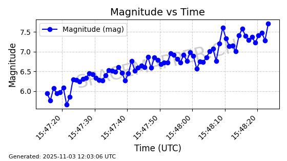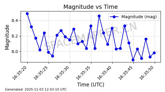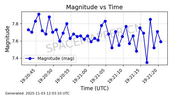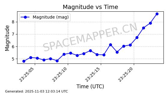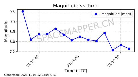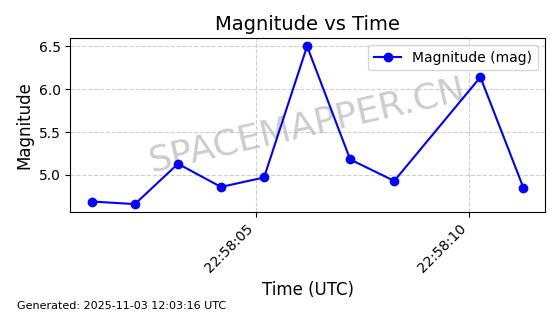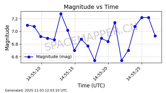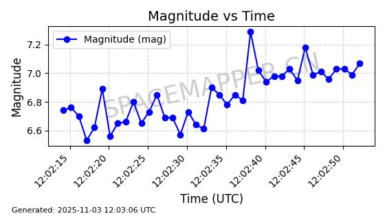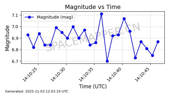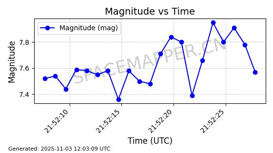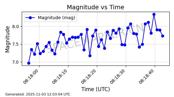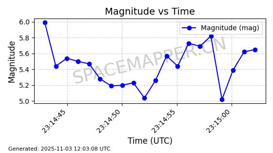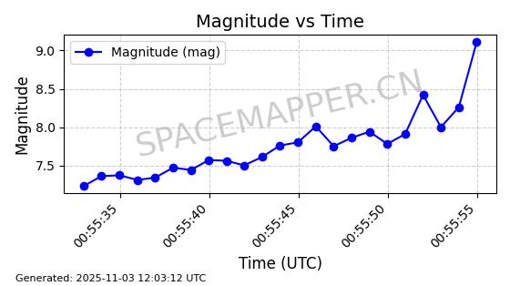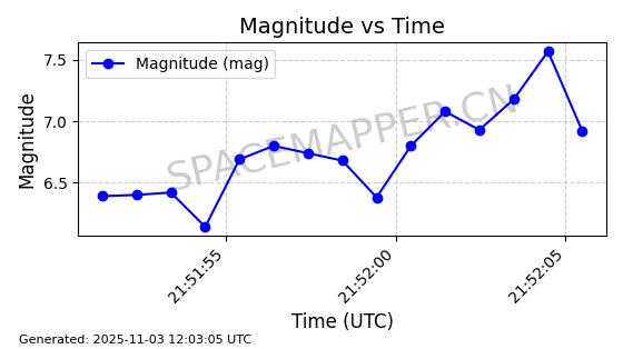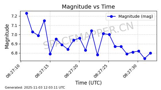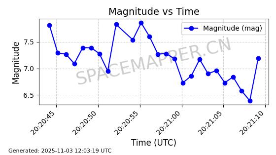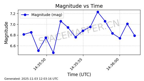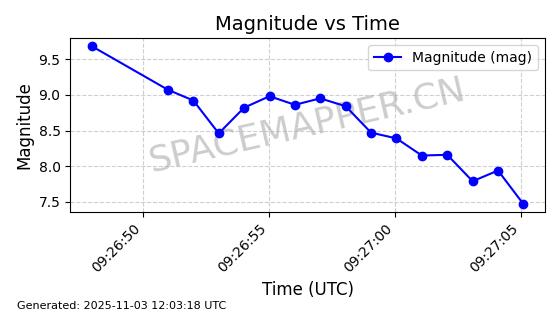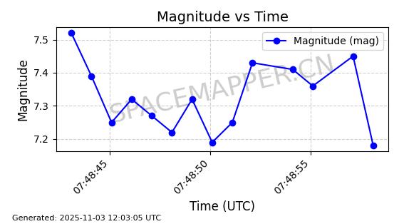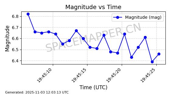 | STARLINK-32280 | 60736 | 60736 | 2024-08-28 同日期轨道 2024-152S 同批次轨道 | 已陨落 | 88分钟 | 53.1203 | 186.634 | 198.748 | 0.0009218 | 2025-10-15 04:42:25 | ||