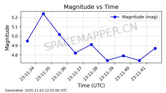 | STARLINK-32223 | 60373 | 60373 | 2024-08-04 同日期轨道 2024-138U 同批次轨道 | 在轨 | 94分钟 | 53.1590 | 474.153 | 476.119 | 0.0001434 | 2025-11-01 00:01:10 | ||