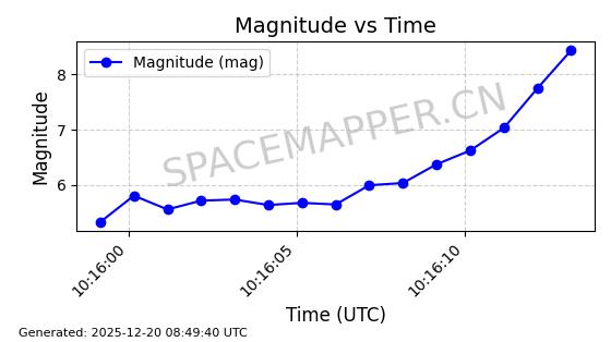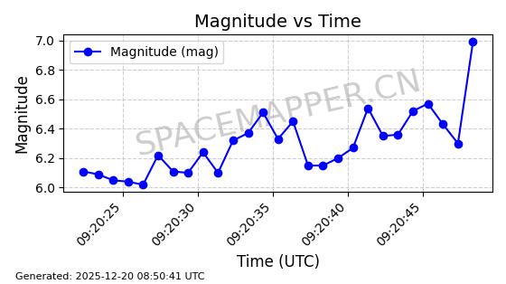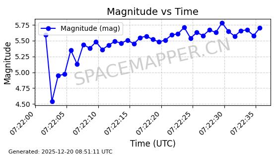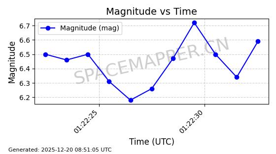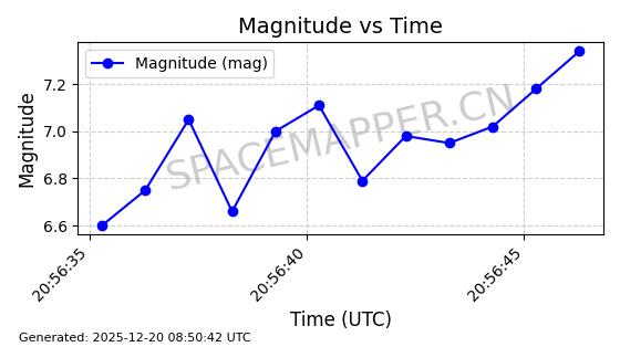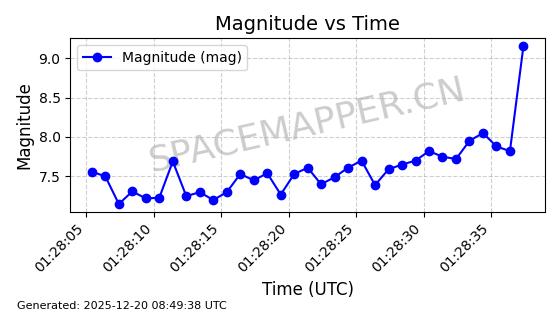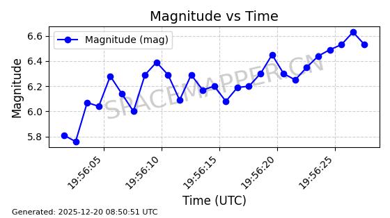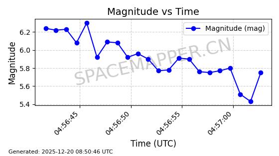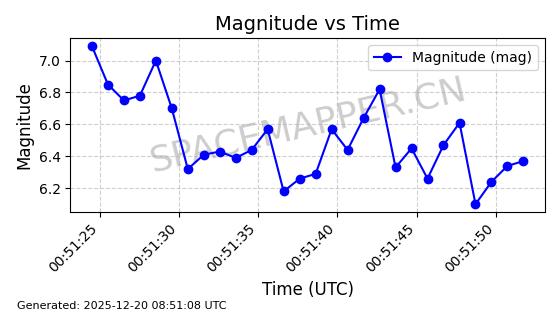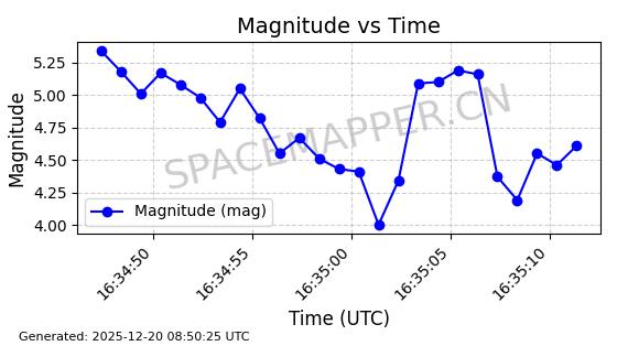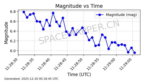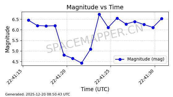 | STARLINK-32364 | 61622 | 61622 | 2024-10-23 同日期轨道 2024-191B 同批次轨道 | 在轨 | 94分钟 | 43.0026 | 482.34 | 483.762 | 0.0001035 | 2025-12-19 00:58:34 | ||